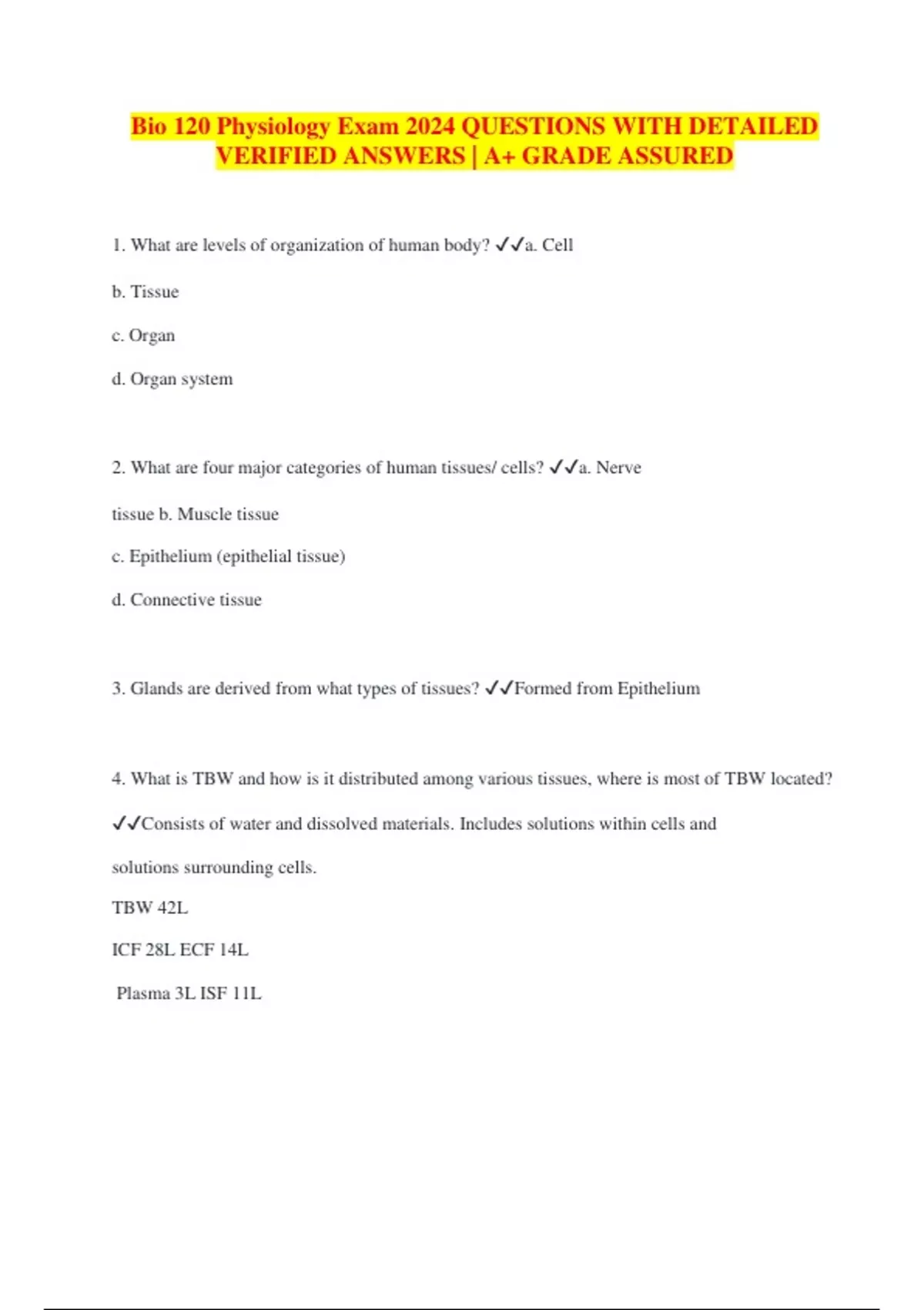 Bio 120 Physiology Exam 2024 QUESTIONS WITH DETAILED VERIFIED ANSWERS | A+ GRADE ASSURED 1. What are levels of organization of human body? a. Cell b. Tissue c. Organ d. Organ system 2. What are four major categories of human tissues/ cells? a. Nerve tissue b. Muscle tissue c. Epithelium (epithelial tissue) d. Connective tissue 3. Glands are derived from what types of tissues? Formed from Epithelium 4. What is TBW and how is it distributed among various tissues, where is most of TBW located? Consists of water and dissolved materials. Includes solutions within cells and solutions surrounding cells. TBW 42L ICF 28L ECF 14L Plasma 3L ISF 11L