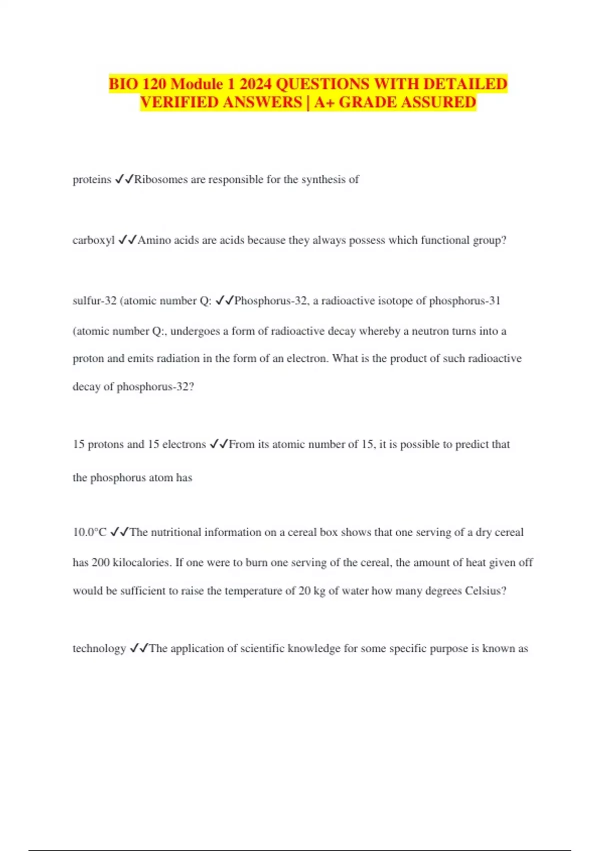 BIO 120 Module 1 2024 QUESTIONS WITH DETAILED VERIFIED ANSWERS | A+ GRADE ASSURED proteins Ribosomes are responsible for the synthesis of carboxyl Amino acids are acids because they always possess which functional group? sulfur-32 (atomic number Q: Phosphorus-32, a radioactive isotope of phosphorus-31 (atomic number Q:, undergoes a form of radioactive decay whereby a neutron turns into a proton and emits radiation in the form of an electron. What is the product of such radioactive decay of phosphorus-32? 15 protons and 15 electrons From its atomic number of 15, it is possible to predict that the phosphorus atom has 10.0°C The nutritional information on a cereal box shows that one serving of a dry cereal has 200 kilocalories. If one were to burn one serving of the cereal, the amount of heat given off would be sufficient to raise the temperature of 20 kg of water how many degrees Celsius? technology The application of scientific knowledge for some specific purpose is known as