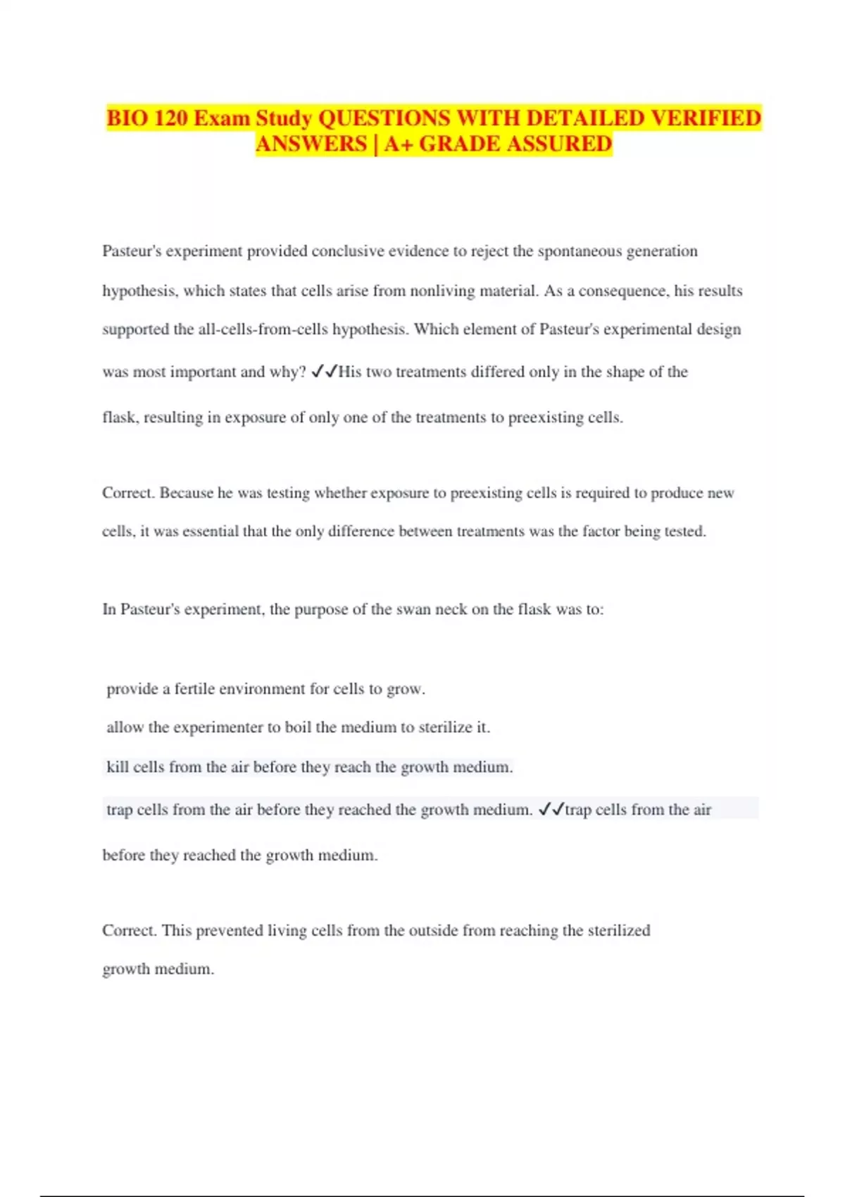 BIO 120 Exam Study QUESTIONS WITH DETAILED VERIFIED ANSWERS | A+ GRADE ASSURED Pasteur's experiment provided conclusive evidence to reject the spontaneous generation hypothesis, which states that cells arise from nonliving material. As a consequence, his results supported the all-cells-from-cells hypothesis. Which element of Pasteur's experimental design was most important and why? His two treatments differed only in the shape of the flask, resulting in exposure of only one of the treatments to preexisting cells. Correct. Because he was testing whether exposure to preexisting cells is required to produce new cells, it was essential that the only difference between treatments was the factor being tested. In Pasteur's experiment, the purpose of the swan neck on the flask was to: provide a fertile environment for cells to grow. allow the experimenter to boil the medium to sterilize it. kill cells from the air before they reach the growth medium. trap cells from the air before they reached the growth medium. trap cells from the air before they reached the growth medium. Correct. This prevented living cells from the outside from reaching the sterilized growth medium.