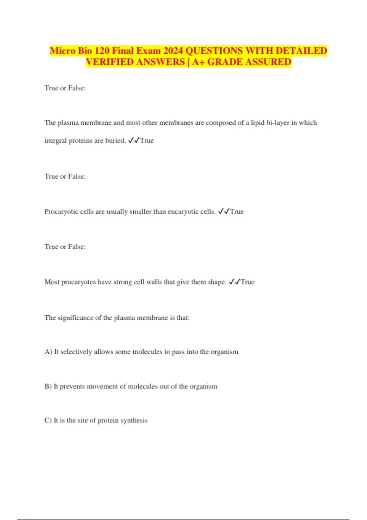 Micro Bio 120 Final Exam 2024 QUESTIONS WITH DETAILED VERIFIED ANSWERS | A+ GRADE ASSURED True or False: The plasma membrane and most other membranes are composed of a lipid bi-layer in which integral proteins are buried. True True or False: Procaryotic cells are usually smaller than eucaryotic cells. True True or False: Most procaryotes have strong cell walls that give them shape. True The significance of the plasma membrane is that: A) It selectively allows some molecules to pass into the organism B) It prevents movement of molecules out of the organism C) It is the site of protein synthesis
