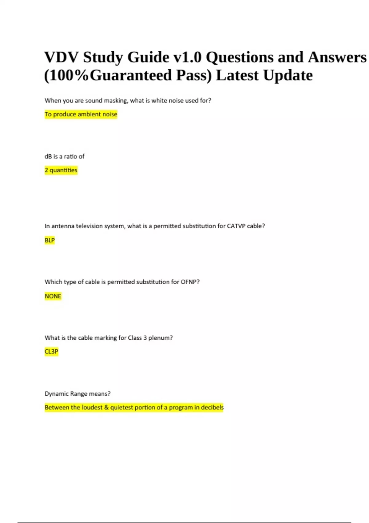 VDV Study Guide v1.0 Questions and Answers (100%Guaranteed Pass) Latest Update. When you are sound masking, what is white noise used for? To produce ambient noise dB is a ratio of 2 quantities In antenna television system, what is a permitted substitution for CATVP cable? BLP Which type of cable is permitted substitution for OFNP? NONE What is the cable marking for Class 3 plenum? CL3P Dynamic Range means? Between the loudest & quietest portion of a program in decibels VDV Study Guide v1.0 Questions and Answers (100%Guaranteed Pass) Latest Update Hierarchy of cables CMP>CMR>CM>CMG>CMX [820.154(B)] Maximum untwist at connector of CAT 5E .5 inch (13mm) What type of termination for voice application? 66 Block What system uses a one piece pass through system Bixby or Bix Which connector for CCTV is used to terminate both sides? BNC.