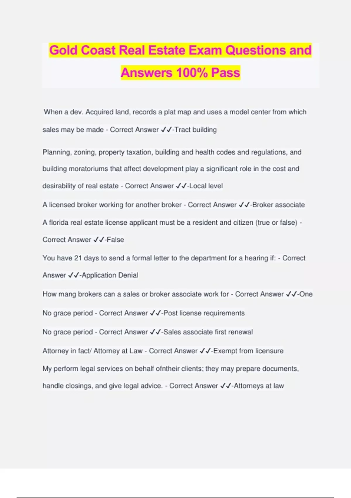 Gold Coast Real Estate Exam Questions and Answers 100% Pass
