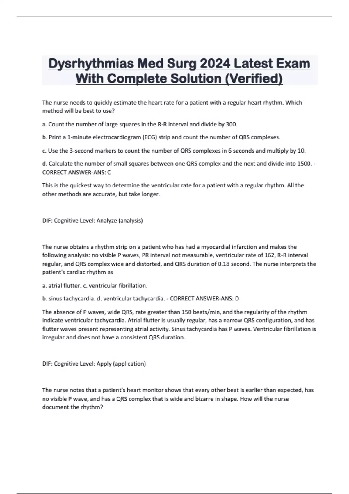 Dysrhythmias Med Surg 2024 Latest Exam With Complete Solution (Verified) The nurse needs to quickly estimate the heart rate for a patient with a regular heart rhythm. Which method will be best to use? a. Count the number of large squares in the R-R interval and divide by 300. b. Print a 1-minute electrocardiogram (ECG) strip and count the number of QRS complexes. c. Use the 3-second markers to count the number of QRS complexes in 6 seconds and multiply by 10. d. Calculate the number of small squares between one QRS complex and the next and divide into 1500. - CORRECT ANSWER-ANS: C This is the quickest way to determine the ventricular rate for a patient with a regular rhythm. All the other methods are accurate, but take longer.