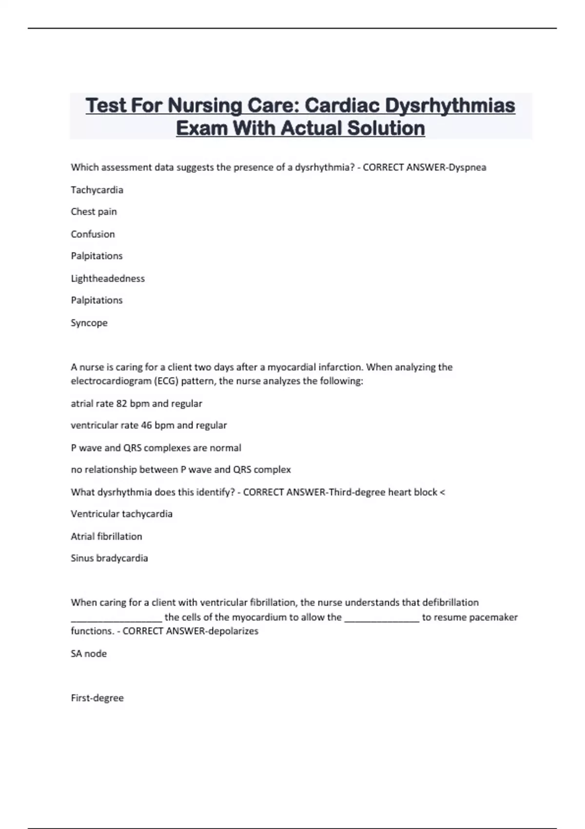 Test For Nursing Care: Cardiac Dysrhythmias Exam With Actual Solution Which assessment data suggests the presence of a dysrhythmia? - CORRECT ANSWER-Dyspnea Tachycardia Chest pain Confusion Palpitations Lightheadedness Palpitations Syncope