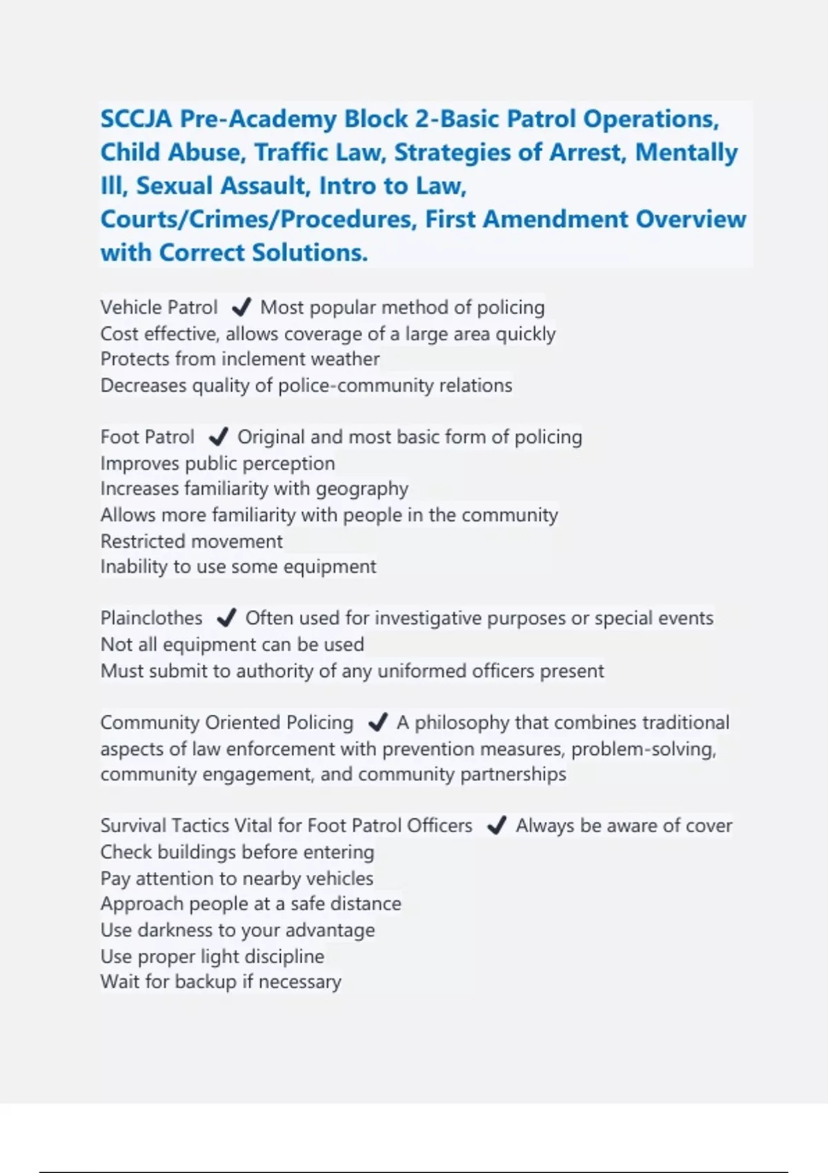 SCCJA Pre-Academy Block 2-Basic Patrol Operations, Child Abuse, Traffic Law, Strategies of Arrest, Mentally Ill, Sexual Assault, Intro to Law, Courts/Crimes/Procedures, First Amendment Overview with Correct Solutions. Vehicle Patrol ️ Most popular method of policing Cost effective, allows coverage of a large area quickly Protects from inclement weather Decreases quality of police-community relations Foot Patrol ️ Original and most basic form of policing Improves public perception Increases familiarity with geography Allows more familiarity with people in the community Restricted movement Inability to use some equipment Plainclothes ️ Often used for investigative purposes or special events Not all equipment can be used Must submit to authority of any uniformed officers present Community Oriented Policing ️ A philosophy that combines traditional aspects of law enforcement with prevention measures, problem-solving, community engagement, and community partnerships Survival Tactics Vital for Foot Patrol Officers ️ Always be aware of cover Check buildings before entering Pay attention to nearby vehicles Approach people at a safe distance Use darkness to your advantage Use proper light discipline Wait for backup if necessary Examples of Community Oriented Policing Programs ️ Neighborhood Watch Citizen Patrol Citizen Police Academy Citizen surveys Problem solving step process for staff Community partnerships Foot patrols Ride-alongs Departmental events Citizen volunteer programs Partnerships with public and private sector organizations, including nonprofits Before Leaving Home ️ Appearance Attitude Weapon Holster Ammunition Carriers Flashlight Scholar ️ Always be training on new techniques and tactics-never stop learning Statesman ️ Interpersonal communication skills and leadership-ability to keep your head when everyone else is losing theirs Warrior ️ Confidence and competence to run towards danger, not because it is easy, but because no one else will Prior to Going In-Service ️ Patrol vehicle inspection and search Getting information about previous shift from the officers you're relieving, supervisors, incident reports, investigators, and FI cards Preventative Patrol ️ The noticeable presence of police officers and patrol vehicles with the intent of deterring crime