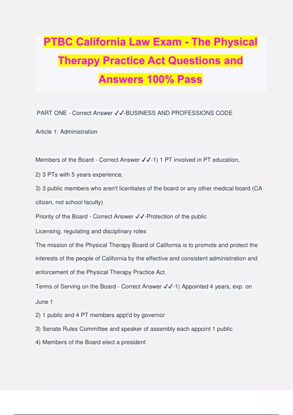 PTBC California Law Exam - The Physical Therapy Practice Act Questions and Answers 100% Pass PART ONE - Correct Answer ️️ -BUSINESS AND PROFESSIONS CODE Article 1: Administration Members of the Board - Correct Answer ️️ -1) 1 PT involved in PT education, 2) 3 PTs with 5 years experience, 3) 3 public members who aren't licentiates of the board or any other medical board (CA citizen, not school faculty) Priority of the Board - Correct Answer ️️ -Protection of the public Licensing, regulating and disciplinary roles The mission of the Physical Therapy Board of California is to promote and protect the interests of the people of California by the effective and consistent administration and enforcement of the Physical Therapy Practice Act. Terms of Serving on the Board - Correct Answer ️️ -1) Appointed 4 years, exp. on June 1 2) 1 public and 4 PT members appt'd by governor 3) Senate Rules Committee and speaker of assembly each appoint 1 public 4) Members of the Board elect a president 5) Board may elect an executive officer to exercise the duties required 6) Board may appoint an commissioner on examination -who is suitable qualified but not a member of the Board but will be subject to the rules and regs and same fees 3) Cannot serve more than 2 consecutive terms Qualifications of Public Members - Correct Answer ️️ -- Be a citizen of CA. - Shall not be an officer or faculty member of any college in PT education. - Shall not be a licentiate of the Medical Board of CA Meetings - Correct Answer ️️ -1 regular meeting annually in Sacramento, LA or SF or from time to time till business is complete Duties of the Members of the Board - Correct Answer ️️ -1) May inspect PT facilities 2) May review patient charts 3) Can suspend and revoke licenses (notice must be given) How is this Chapter cited? - Correct Answer ️️ -This chapter may be cited as the Physical Therapy Practice Act Public Employees - Correct Answer ️️ -PT consultants under contract for the board are considered a public employee; or clerical or other employees necessary to carry out powers and duties of Board Article 2 General Provisions Definition of Physical Therapy - Correct Answer ️️ -"art and science of physical or corrective rehab of any bodily or mental condition of any person by use of physical, chemical or other properties of heat, light, water, electricity...active, passive and resistive exercise and shall include PT evals, treatment planning, instruction and consultative services" ARTICLE 2 General Provisions - Correct Answer ️️ -- NOT ALLOWED: - use of roentgen rays/radioactive materials for diagnostic or therapeutic purposes - electricity for surgical purposes is authorized - diagnosis of disease not under Physical Therapy - can apply topical meds if comply with regs and administration act (conferred with Medical Board of California as to which ones and protocols; but NOT prescribe them Neuromuscular evaluation - Correct Answer ️️ -1) Can perform tissue penetration for evaluation neuro performance 2) Must have authorization from MD/surgeon 3) PT must be certified by the board 4) PT CANNOT develop or make diagnostic or prognostic interpretations of data obtained (violation of the Medical Practice Act) Minimal Time that Patient Records must be kept for - Correct Answer ️️ -7 years. 1) Patient records shall be kept for a period of no less than 7 years following the discharge of the patient 2) Records of unemancipated minors shall be kept at least 1 year after the