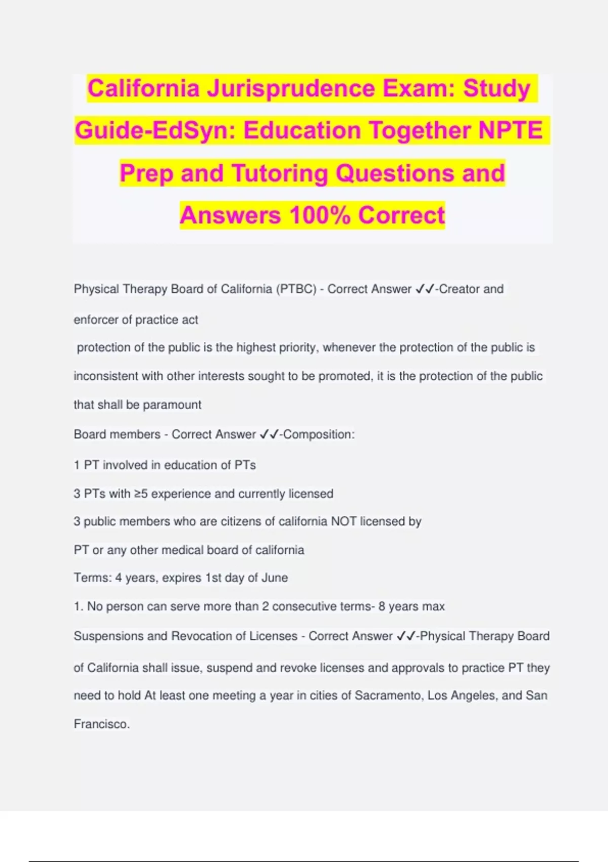 California Jurisprudence Exam: Study Guide-EdSyn: Education Together NPTE Prep and Tutoring Questions and Answers 100% Correct Physical Therapy Board of California (PTBC) - Correct Answer ️️ -Creator and enforcer of practice act protection of the public is the highest priority, whenever the protection of the public is inconsistent with other interests sought to be promoted, it is the protection of the public that shall be paramount Board members - Correct Answer ️️ -Composition: 1 PT involved in education of PTs 3 PTs with ≥5 experience and currently licensed 3 public members who are citizens of california NOT licensed by PT or any other medical board of california Terms: 4 years, expires 1st day of June 1. No person can serve more than 2 consecutive terms- 8 years max Suspensions and Revocation of Licenses - Correct Answer ️️ -Physical Therapy Board of California shall issue, suspend and revoke licenses and approvals to practice PT they need to hold At least one meeting a year in cities of Sacramento, Los Angeles, and San Francisco. General provisions - Correct Answer ️️ -The practice of physical therapy includes the promotion and maintenance of physical fitness to enhance the bodily movement related health and wellness of individuals through the use of physical therapy interventions. Topical medications: - Correct Answer ️️ -topical medication May be administered by a PT through Direct app via Iontophoresis/ Phonophoresis All Topical medications applied shall be ordered by MD, A Physical therapist can NOT prescribe medications Topical medications: - Correct Answer ️️ -approved topical medications are the following Bactericidal / debriding agents, topical anesthetic agents, anti-inflammatory agents, antispasmodic agents, and adrenocortical-steroidsprotocols shall include: description of the meds, actions, indications/contraindications, and proper procedure/technique for application. Certification to Penetrate Tissues for Neuromuscular Evaluation - Correct Answer ️️ - PT's will pass an initial examination for certification process. Certificates renewed with each PT's license (every 2 years) Exam/reexamination is $500, application fee is $100 and renewal fee shall be $50 PTs can perform penetrattion of tissue for purpose of evaluating neuromuscular performance. however, They cannot make diagnostic/prognostic need specified authorization by a MD. Certification: Electroneuromyography:400 hours of training and 200 electroneuromyography examination certification:kinesiologic electromyographic 200 hours of training AND 500 kinesiologic electromyographic examinations. Electroneuromyography - Correct Answer ️️ -is the performance of tissue penetration for the purpose of evaluating neuromuscular performance, and DOES includes the evaluation of specific abnormal potentials and evoked responses. Kinesiological Electromyography: - Correct Answer ️️ - is the phasic activity of individual or multiple muscles in relation to another physical or physiological event or exercise and does NOT include the evaluation of specific abnormal potentials or evoked responses Certification to Penetrate Tissues for Neuromuscular Evaluation - Correct Answer ️️ - PT's will pass an initial examination for certification process. Certificates renewed with each PT's license (every 2 years) Exam/reexamination is $500, application fee is $100 and renewal fee shall be $50 Certification to Penetrate Tissues for Neuromuscular Evaluation - Correct Answer ️️ - Patient must be given a hand-out and have a posted sign reading: The findings in this report do not represent diagnostic interpretations or medical diagnoses. The results of electromyographic examination by the certified examiner are intended for integration by the physician and surgeon with the patient's history, clinical examination, and the results of any other tests performed in establishing a medical diagnosis. Patient records: - Correct Answer ️️ -Kept for at least 7 years after discharge Unemancipated minors are kept for at least 1 year after turning 18 years and not in any case less than 7 years. Licensing of practitioners / Applications - Correct Answer ️️ - License required: - Correct Answer ️️ -Must have license when performing any PT practice for compensation (received or expected)i. All licenses issued by and filed by the PTBC Applicants' qualifications - Correct Answer ️️ -needs to be over 18, not addicted to any substance, completed education and training not committed any crimes Exams required to obtain license - Correct Answer ️️ -National physical therapy examination (NPTE) is require to obtain license laws and regulations Use of "P.T." - Correct Answer ️️ -Only licensed physical therapist can use titles licensed or registered physiotherapist or initials "P.T", "L.P.T", "R.P.T." In written communication can use title "Doctor" or "Dr." before name if immediately followed by UNABBREVIATED specification of degree held by licensee. In spoken communication can use title "Doctor" if speaker specifies that he/she is physical therapist. Must specify the type of doctor if using the title Use of PT Aides:. - Correct Answer ️️ -the use of aides require Immediate supervision for all directly to patient (tasks other than non-related tasks to are the following transport of patient, physical support only during gait or transfer training, housekeeping, clerical duties.- The PT AT ALL TIMES needs to be in same facility and close proximity. PT must perform direct care on same day if an aide provides direct patient-related tasks Physical Therapist License Applicant (PTLA) - Correct Answer ️️ -Graduates can perform as a PT under DIRECT and IMMEDIATE supervision of a licensed PT pendin