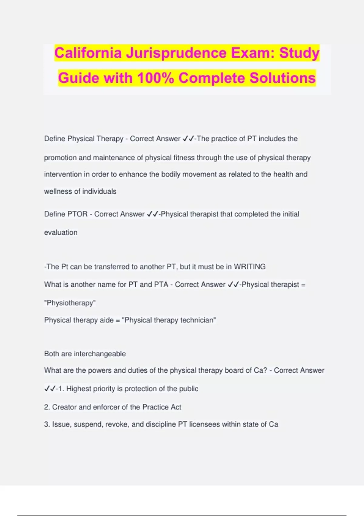 California Jurisprudence Exam: Study Guide with 100% Complete Solutions Define Physical Therapy - Correct Answer ️️ -The practice of PT includes the promotion and maintenance of physical fitness through the use of physical therapy intervention in order to enhance the bodily movement as related to the health and wellness of individuals Define PTOR - Correct Answer ️️ -Physical therapist that completed the initial evaluation -The Pt can be transferred to another PT, but it must be in WRITING What is another name for PT and PTA - Correct Answer ️️ -Physical therapist = "Physiotherapy" Physical therapy aide = "Physical therapy technician" Both are interchangeable What are the powers and duties of the physical therapy board of Ca? - Correct Answer ️️ -1. Highest priority is protection of the public 2. Creator and enforcer of the Practice Act 3. Issue, suspend, revoke, and discipline PT licensees within state of Ca 4. Publishing newsletter denoting actions taken by the board 5.Board shall hear all matters 6.Appoint individuals to proctor examinations, those appointed CANNOT be a board member Do the PTBC have the authority to inspect PT facilities and Pt records - Correct Answer ️️ --Yes, they can obtain Pt records as long as they get written or verbal consent -If the Pt's written authorization has been provided, the release of records shall be given within 15 days or a penalty of $1,000 will occur for every day starting on the 16th day What is the "Board" made up of? - Correct Answer ️️ -1 Licensed PT involved with education 3 Licensed PT's with at least 5 years experience 3 persons of the public who do not hold a license How long can a Board member serve? - Correct Answer ️️ -Terms: Four years, expires 1st day of June -No person can serve more than two consecutive terms- eight years max What are the qualification required for licensure? - Correct Answer ️️ --18 yrs or older -graduated from an accredited program -Filed an application with the board, and meets the requirements prescribed -Not addicted to any substance -Not committed any crime -An applicant can only qualify once to as a PTLA/ PTALA PTLA/PTALA practicing restrictions - Correct Answer ️️ -PTLA must be under the DIRECT and IMMEDIATE supervision unlike PTALA -A licensed supervising PT must be on-site at ALL times for BOTH -Can practice 120 days pending the results of the first licensing examination administered. -A supervising PT shall document receipt of the letter authorizing the PTLA or PTA