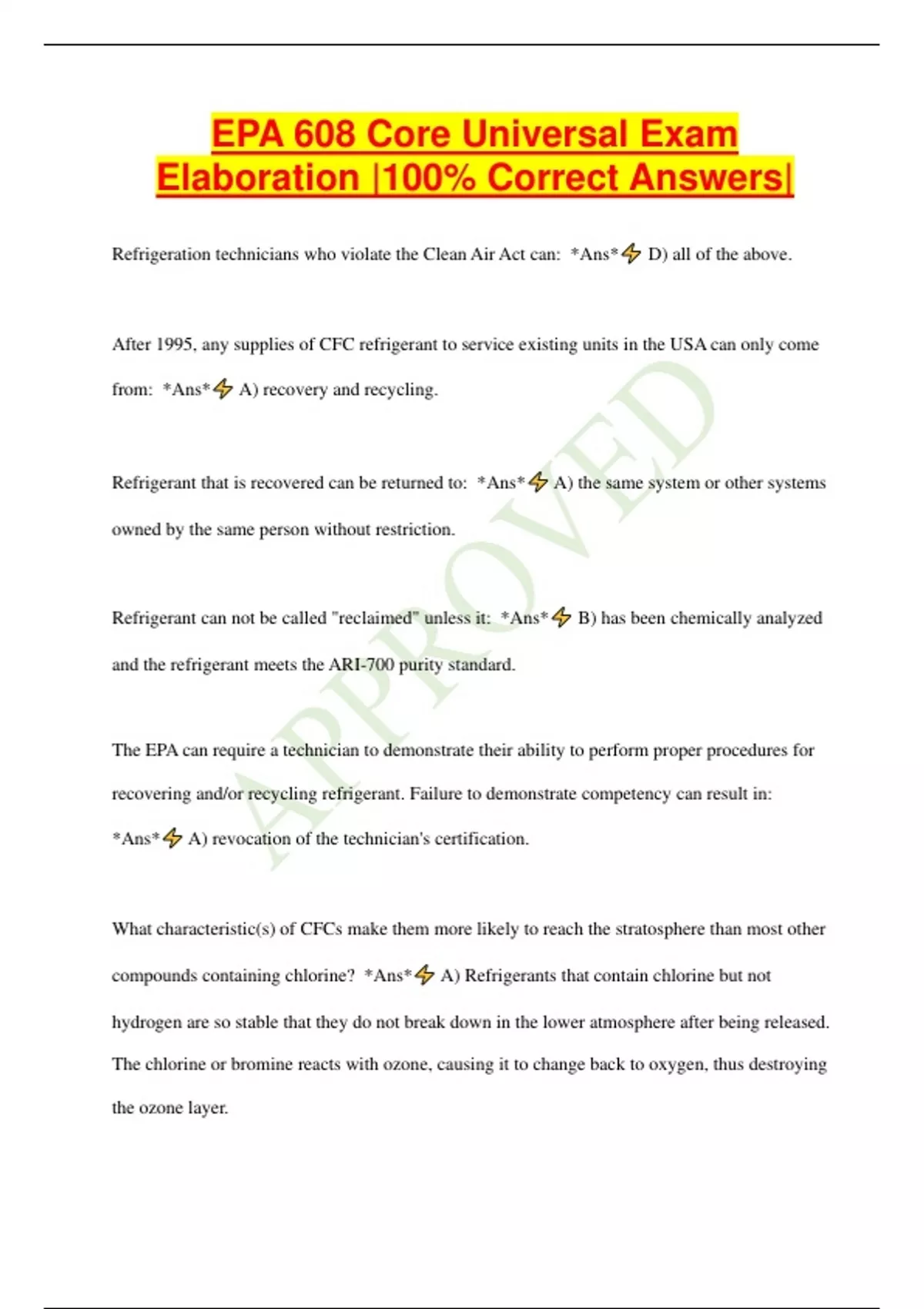 EPA 608 Core Universal Exam Elaboration |100% Correct Answers| Refrigeration technicians who violate the Clean Air Act can: *Ans* D) all of the above. After 1995, any supplies of CFC refrigerant to service existing units in the USA can only come from: *Ans* A) recovery and recycling. Refrigerant that is recovered can be returned to: *Ans* A) the same system or other systems owned by the same person without restriction. Refrigerant can not be called "reclaimed" unless it: *Ans* B) has been chemically analyzed and the refrigerant meets the ARI-700 purity standard. The EPA can require a technician to demonstrate their ability to perform proper procedures for recovering and/or recycling refrigerant. Failure to demonstrate competency can result in: *Ans* A) revocation of the technician's certification. What characteristic(s) of CFCs make them more likely to reach the stratosphere than most other compounds containing chlorine? *Ans* A) Refrigerants that contain chlorine but not hydrogen are so stable that they do not break down in the lower atmosphere after being released. The chlorine or bromine reacts with ozone, causing it to change back to oxygen, thus destroying the ozone layer. A system is considered dehydrated when: *Ans* A) the vacuum indicator shows you have reached and held the required finished vacuum. Disposable refrigerant containers are used for _______ refrigerant. *Ans* C) virgin Which refrigerant is an HCFC? *Ans* A) R-124 What statement is true about an azeotropic refrigerant mixture? *Ans* D) It is a mixture that acts like a single-component refrigerant over its entire range. Chlorofluorocarbons (CFCs) and hydrochlorofluorocarbons (HCFCs) have which of the following in common? *Ans* D) They must be recovered before opening or disposing of appliances. To scrap a disposable cylinder, the internal cylinder pressure should be reduced to at least: *Ans* A) 0 psig. Manifold gauge sets are often color coded, when this is done, the high pressure gauge is color coded: *Ans* A) red. In general, blended refrigerants should be charged: *Ans* C) as a liquid. Blended refrigerants leak from a system: *Ans* B) in uneven amounts d