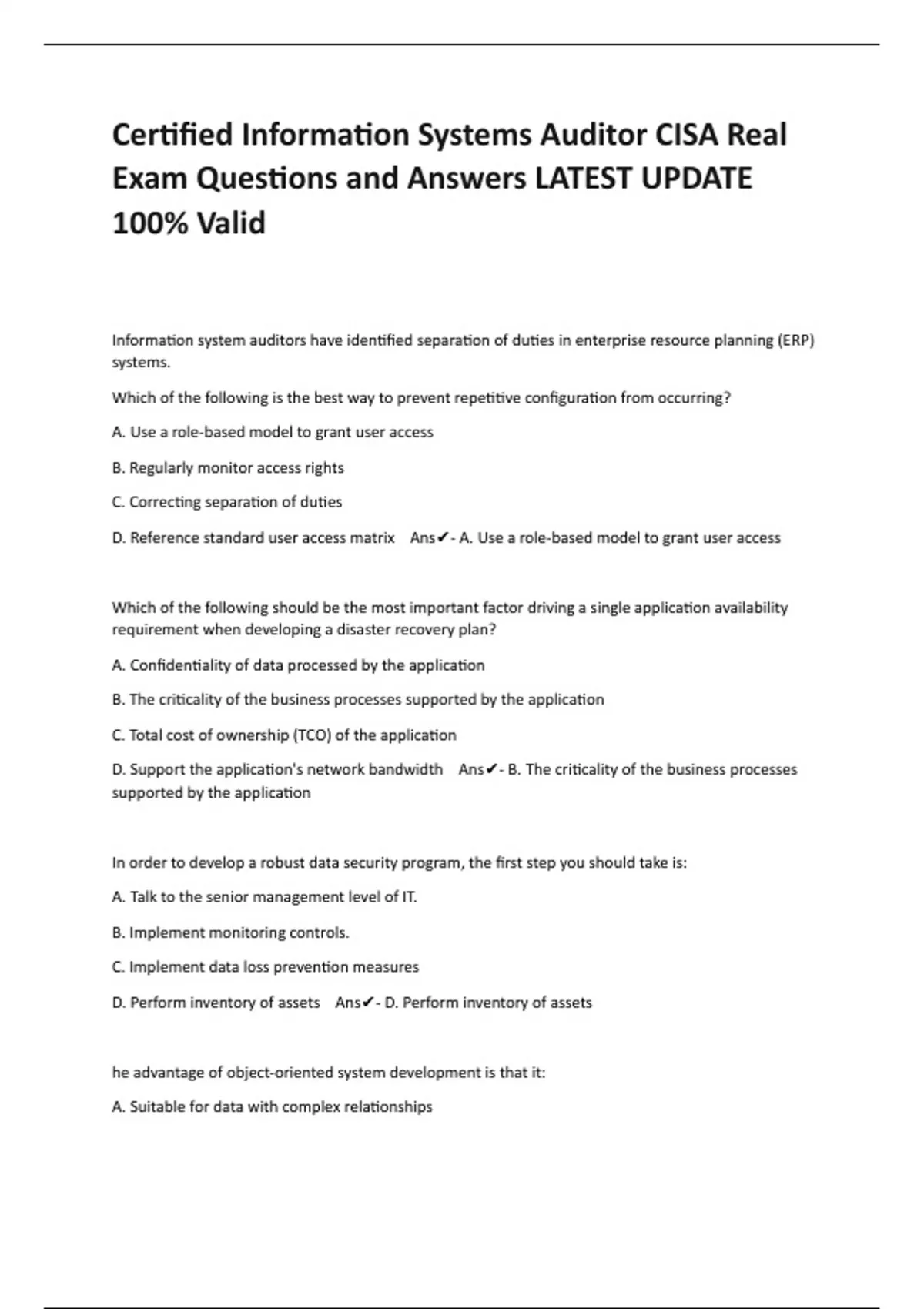 Certified Information Systems Auditor CISA Real Exam Questions and Answers LATEST UPDATE 100% Valid