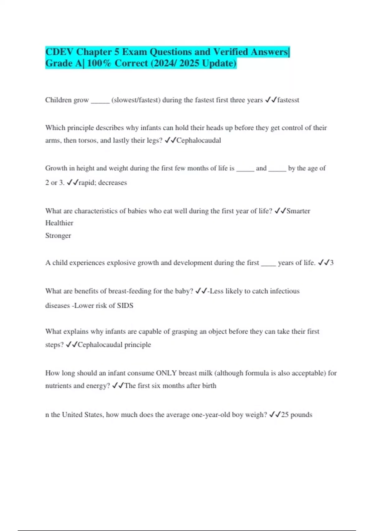 CDEV Chapter 5 Exam Questions and Verified Answers| Grade A| 100% Correct (2024/ 2025 Update) Children grow _____ (slowest/fastest) during the fastest first three years fastesst Which principle describes why infants can hold their heads up before they get control of their arms, then torsos, and lastly their legs? Cephalocaudal Growth in height and weight during the first few months of life is _____ and _____ by the age of 2 or 3. rapid; decreases What are characteristics of babies who eat well during the first year of life? Smarter Healthier Stronger A child experiences explosive growth and development during the first ____ years of life. 3 What are benefits of breast-feeding for the baby? -Less likely to catch infectious diseases -Lower risk of SIDS What explains why infants are capable of grasping an object before they can take their first steps? Cephalocaudal principle How long should an infant consume ONLY breast milk (although formula is also acceptable) for nutrients and energy? The first six months after birth n the United States, how much does the average one-year-old boy weigh? 25 pounds