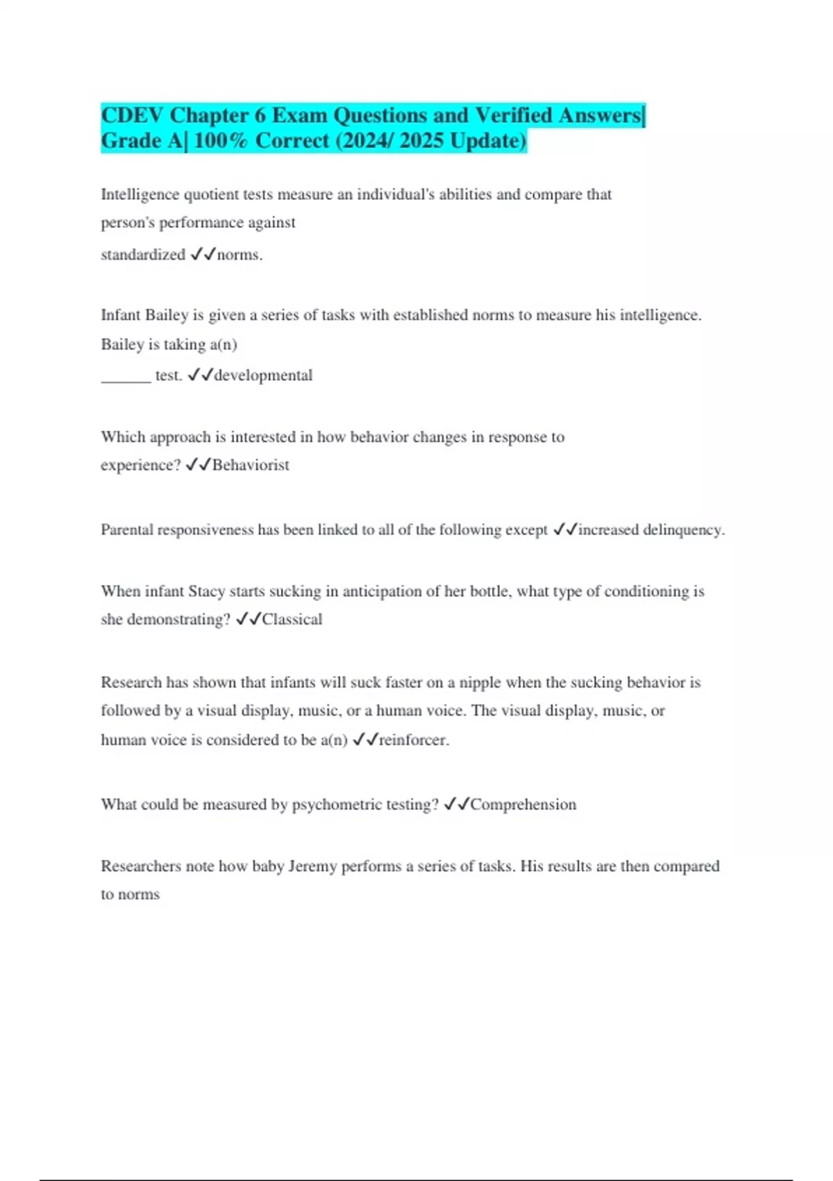 CDEV Chapter 6 Exam Questions and Verified Answers| Grade A| 100% Correct (2024/ 2025 Update) Intelligence quotient tests measure an individual's abilities and compare that person's performance against standardized norms. Infant Bailey is given a series of tasks with established norms to measure his intelligence. Bailey is taking a(n) ______ test. developmental Which approach is interested in how behavior changes in response to experience? Behaviorist Parental responsiveness has been linked to all of the following except increased delinquency. When infant Stacy starts sucking in anticipation of her bottle, what type of conditioning is she demonstrating? Classical Research has shown that infants will suck faster on a nipple when the sucking behavior is followed by a visual display, music, or a human voice. The visual display, music, or human voice is considered to be a(n) reinforcer. What could be measured by psychometric testing? Comprehension Researchers note how baby Jeremy performs a series of tasks. His results are then compared to norms