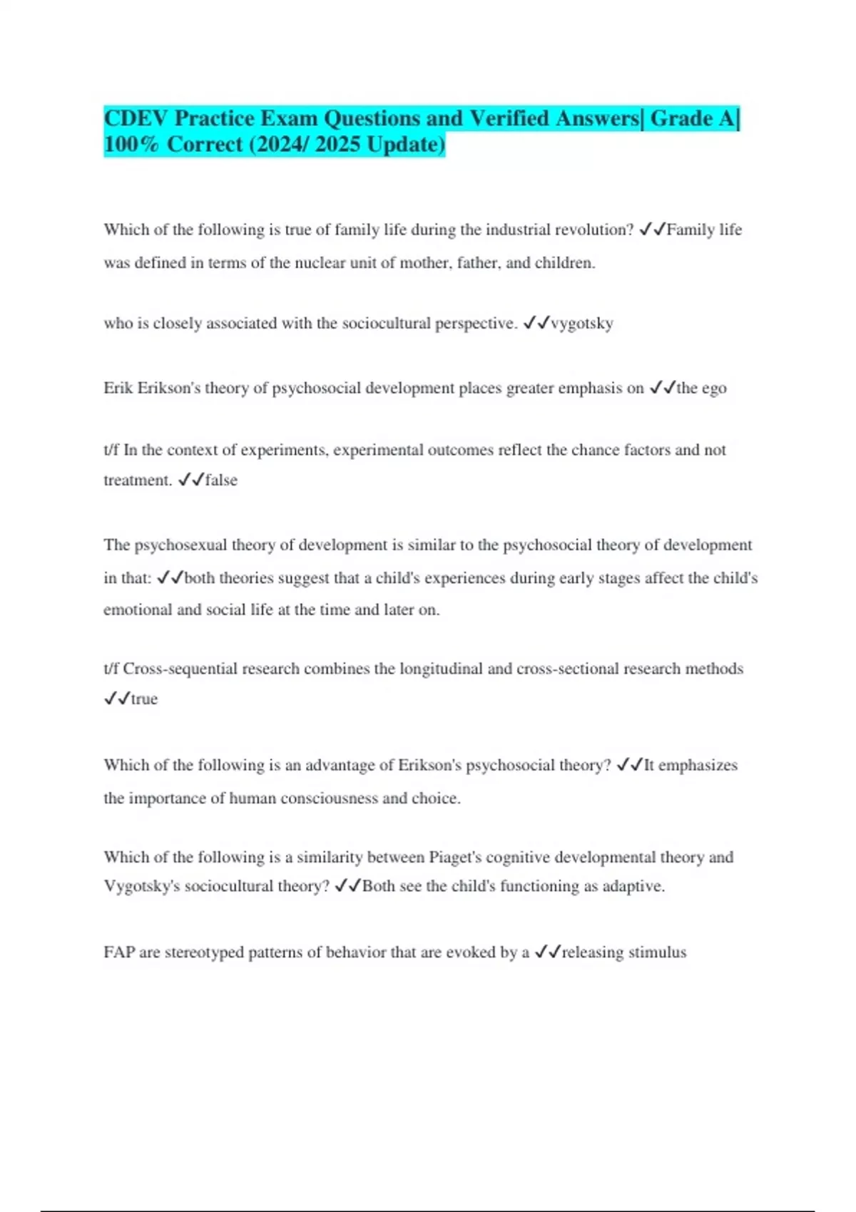 CDEV Practice Exam Questions and Verified Answers| Grade A| 100% Correct (2024/ 2025 Update) Which of the following is true of family life during the industrial revolution? Family life was defined in terms of the nuclear unit of mother, father, and children. who is closely associated with the sociocultural perspective. vygotsky Erik Erikson's theory of psychosocial development places greater emphasis on the ego t/f In the context of experiments, experimental outcomes reflect the chance factors and not treatment. false The psychosexual theory of development is similar to the psychosocial theory of development in that: both theories suggest that a child's experiences during early stages affect the child's emotional and social life at the time and later on. t/f Cross-sequential research combines the longitudinal and cross-sectional research methods true Which of the following is an advantage of Erikson's psychosocial theory? It emphasizes the importance of human consciousness and choice. Which of the following is a similarity between Piaget's cognitive developmental theory and Vygotsky's sociocultural theory? Both see the child's functioning as adaptive. FAP are stereotyped patterns of behavior that are evoked by a releasing stimulus