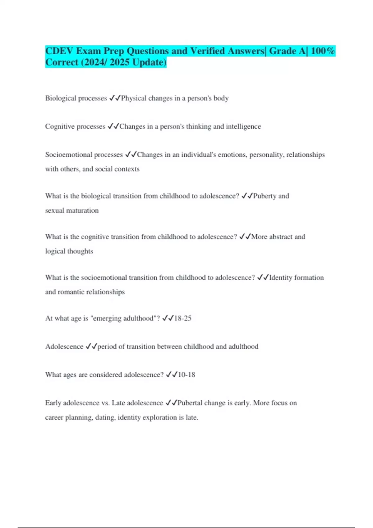 CDEV Exam Prep Questions and Verified Answers| Grade A| 100% Correct (2024/ 2025 Update) Biological processes Physical changes in a person's body Cognitive processes Changes in a person's thinking and intelligence Socioemotional processes Changes in an individual's emotions, personality, relationships with others, and social contexts What is the biological transition from childhood to adolescence? Puberty and sexual maturation What is the cognitive transition from childhood to adolescence? More abstract and logical thoughts What is the socioemotional transition from childhood to adolescence? Identity formation and romantic relationships At what age is "emerging adulthood"? 18-25 Adolescence period of transition between childhood and adulthood What ages are considered adolescence? 10-18 Early adolescence vs. Late adolescence Pubertal change is early. More focus on career planning, dating, identity exploration is late