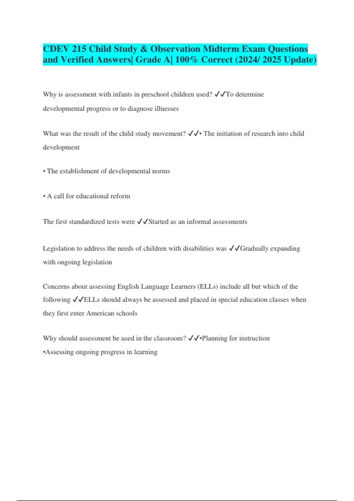 CDEV 215 Child Study & Observation Midterm Exam Questions and Verified Answers| Grade A| 100% Correct (2024/ 2025 Update) Why is assessment with infants in preschool children used? To determine developmental progress or to diagnose illnesses What was the result of the child study movement? • The initiation of research into child development • The establishment of developmental norms • A call for educational reform The first standardized tests were Started as an informal assessments Legislation to address the needs of children with disabilities was Gradually expanding with ongoing legislation Concerns about assessing English Language Learners (ELLs) include all but which of the following ELLs should always be assessed and placed in special education classes when they first enter American schools Why should assessment be used in the classroom? •Planning for instruction •Assessing ongoing progress in learning