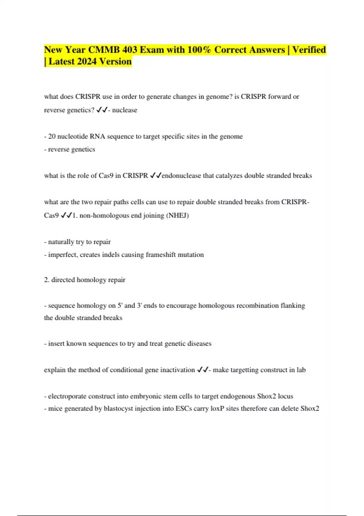 New Year CMMB 403 Exam with 100% Correct Answers | Verified | Latest 2024 Version what does CRISPR use in order to generate changes in genome? is CRISPR forward or reverse genetics? - nuclease - 20 nucleotide RNA sequence to target specific sites in the genome - reverse genetics what is the role of Cas9 in CRISPR endonuclease that catalyzes double stranded breaks what are the two repair paths cells can use to repair double stranded breaks from CRISPRCas9 1. non-homologous end joining (NHEJ) - naturally try to repair - imperfect, creates indels causing frameshift mutation 2. directed homology repair - sequence homology on 5' and 3' ends to encourage homologous recombination flanking the double stranded breaks - insert known sequences to try and treat genetic diseases explain the method of conditional gene inactivation - make targetting construct in lab - electroporate construct into embryonic stem cells to target endogenous Shox2 locus - mice generated by blastocyst injection into ESCs carry loxP sites therefore can delete Shox2