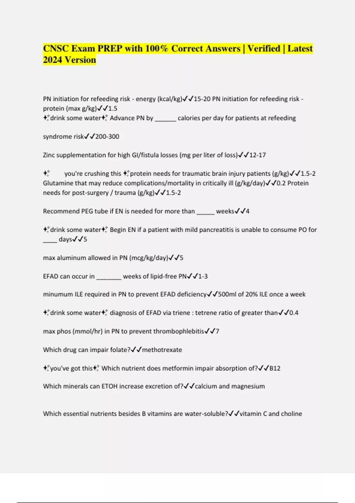 CNSC Exam PREP with 100% Correct Answers | Verified | Latest 2024 Version PN initiation for refeeding risk - energy (kcal/kg)15-20 PN initiation for refeeding risk - protein (max g/kg)1.5 drink some water Advance PN by ______ calories per day for patients at refeeding syndrome risk200-300 Zinc supplementation for high GI/fistula losses (mg per liter of loss)12-17 you're crushing this protein needs for traumatic brain injury patients (g/kg)1.5-2 Glutamine that may reduce complications/mortality in critically ill (g/kg/day)0.2 Protein needs for post-surgery / trauma (g/kg)1.5-2 Recommend PEG tube if EN is needed for more than _____ weeks4 drink some water Begin EN if a patient with mild pancreatitis is unable to consume PO for ____ days5 max aluminum allowed in PN (mcg/kg/day)5 EFAD can occur in _______ weeks of lipid-free PN1-3 minumum ILE required in PN to prevent EFAD deficiency500ml of 20% ILE once a week drink some water diagnosis of EFAD via triene : tetrene ratio of greater than0.4 max phos (mmol/hr) in PN to prevent thrombophlebitis7 Which drug can impair folate?methotrexate you've got this Which nutrient does metformin impair absorption of?B12 Which minerals can ETOH increase excretion of?calcium and magnesium Which essential nutrients besides B vitamins are water-soluble?vitamin C and choline