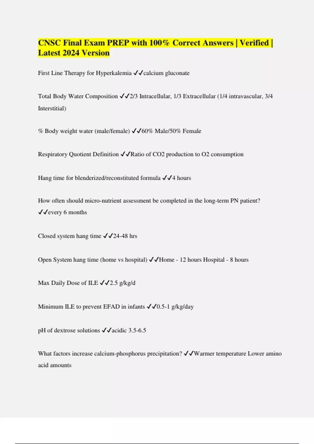 CNSC Final Exam PREP with 100% Correct Answers | Verified | Latest 2024 Version First Line Therapy for Hyperkalemia calcium gluconate Total Body Water Composition 2/3 Intracellular, 1/3 Extracellular (1/4 intravascular, 3/4 Interstitial) % Body weight water (male/female) 60% Male/50% Female Respiratory Quotient Definition Ratio of CO2 production to O2 consumption Hang time for blenderized/reconstituted formula 4 hours How often should micro-nutrient assessment be completed in the long-term PN patient? every 6 months Closed system hang time 24-48 hrs Open System hang time (home vs hospital) Home - 12 hours Hospital - 8 hours Max Daily Dose of ILE 2.5 g/kg/d Minimum ILE to prevent EFAD in infants 0.5-1 g/kg/day pH of dextrose solutions acidic 3.5-6.5 What factors increase calcium-phosphorus precipitation? Warmer temperature Lower amino acid amounts