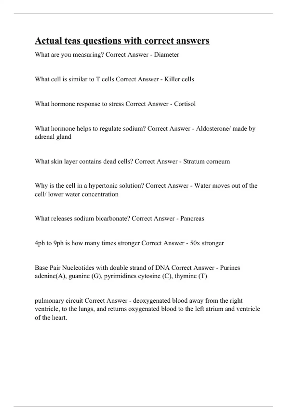 What are you measuring? Correct Answer - Diameter What cell is similar to T cells Correct Answer - Killer cells What hormone response to stress Correct Answer - Cortisol What hormone helps to regulate sodium? Correct Answer - Aldosterone/ made by adrenal gland What skin layer contains dead cells? Correct Answer - Stratum corneum Why is the cell in a hypertonic solution? Correct Answer - Water moves out of the cell/ lower water concentration What releases sodium bicarbonate? Correct Answer - Pancreas 4ph to 9ph is how many times stronger Correct Answer - 50x stronger Base Pair Nucleotides with double strand of DNA Correct Answer - Purines adenine(A), guanine (G), pyrimidines cytosine (C), thymine (T) pulmonary circuit Correct Answer - deoxygenated blood away from the right ventricle, to the lungs, and returns oxygenated blood to the left atrium and ventricle of the heart.