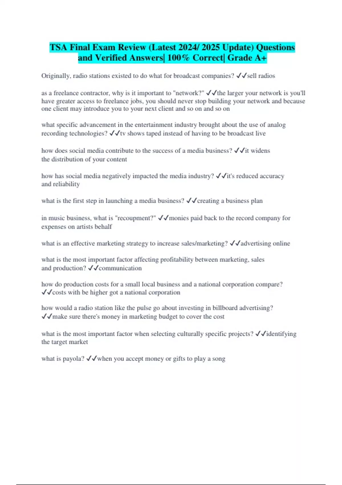 TSA Final Exam Review (Latest 2024/ 2025 Update) Questions and Verified Answers| 100% Correct| Grade A+ Originally, radio stations existed to do what for broadcast companies? sell radios as a freelance contractor, why is it important to "network?" the larger your network is you'll have greater access to freelance jobs, you should never stop building your network and because one client may introduce you to your next client and so on and so on what specific advancement in the entertainment industry brought about the use of analog recording technologies? tv shows taped instead of having to be broadcast live how does social media contribute to the success of a media business? it widens the distribution of your content how has social media negatively impacted the media industry? it's reduced accuracy and reliability what is the first step in launching a media business? creating a business plan in music business, what is "recoupment?" monies paid back to the record company for expenses on artists behalf what is an effective marketing strategy to increase sales/marketing? advertising online what is the most important factor affecting profitability between marketing, sales and production? communication how do production costs for a small local business and a national corporation compare? costs with be higher got a national corporation how would a radio station like the pulse go about investing in billboard advertising? make sure there's money in marketing budget to cover the cost what is the most important factor when selecting culturally specific projects? identifying the target market what is payola? when you accept money or gifts to play a song