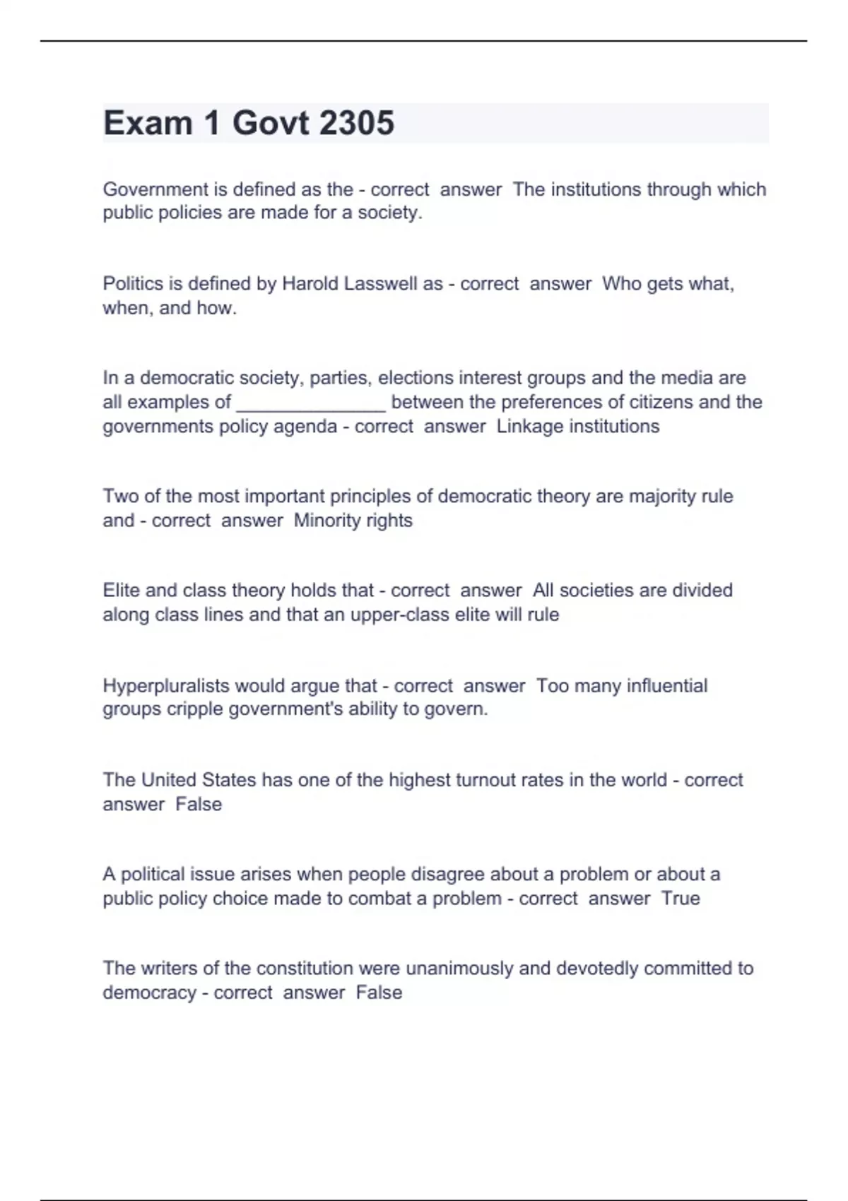 Exam 1 Govt 2305 Collin College Questions with complete solution Exam 1 Govt 2305 Government is defined as the - correct answer The institutions through which public policies are made for a society. Politics is defined by Harold Lasswell as - correct answer Who gets what, when, and how. In a democratic society, parties, elections interest groups and the media are all examples of ______________ between the preferences of citizens and the governments policy agenda - correct answer Linkage institutions Two of the most important principles of democratic theory are majority rule and - correct answer Minority rights Elite and class theory holds that - correct answer All societies are divided along class lines and that an upper-class elite will rule Hyperpluralists would argue that - correct answer Too many influential groups cripple government's ability to govern. The United States has one of the highest turnout rates in the world - correct answer False A political issue arises