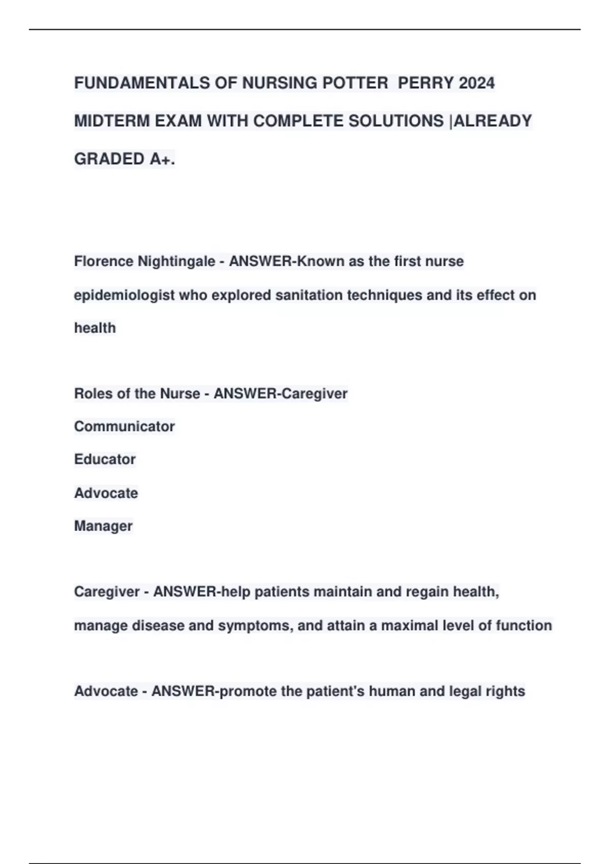 FUNDAMENTALS OF NURSING POTTER PERRY 2024 MIDTERM EXAM WITH COMPLETE SOLUTIONS |ALREADY GRADED A+.