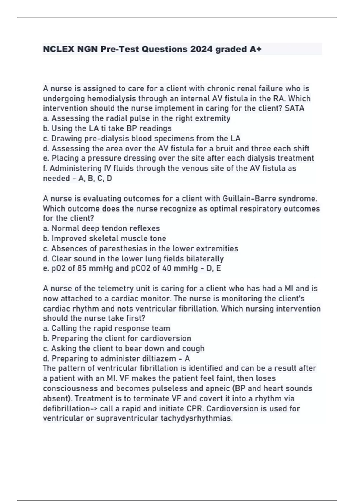NCLEX NGN Pre-Test Questions 2024 graded A+ A nurse is assigned to care for a client with chronic renal failure who is undergoing hemodialysis through an internal AV fistula in the RA. Which intervention should the nurse implement in caring for the client? SATA a. Assessing the radial pulse in the right extremity b. Using the LA ti take BP readings c. Drawing pre-dialysis blood specimens from the LA d. Assessing the area over the AV fistula for a bruit and three each shift e. Placing a pressure dressing over the site after each dialysis treatment f. Administering IV fluids through the venous site of the AV fistula as needed - A, B, C, D A nurse is evaluating outcomes for a client with Guillain-Barre syndrome. Which outcome does the nurse recognize as optimal respiratory outcomes for the client? a. Normal deep tendon reflexes b. Improved skeletal muscle tone c. Absences of paresthesias in the lower extremities d. Clear sound in the lower lung fields bilaterally e. pO2 of 85 mmHg and pCO2 of 40 mmHg - D, E A nurse of the telemetry unit is caring for a client who has had a MI and is now attached to a cardiac monitor. The nurse is monitoring the client's cardiac rhythm and nots ventricular fibrillation. Which nursing intervention should the nurse take first? a. Calling the rapid response team b. Preparing the client for cardioversion c. Asking the client to bear down and cough d. Preparing to administer diltiazem - A The pattern of ventricular fibrillation is identified and can be a result after a patient with an MI. VF makes the patient feel faint, then loses consciousness and becomes pulseless and apneic (BP and heart sounds absent). Treatment is to terminate VF and covert it into a rhythm via defibrillation- call a rapid and initiate CPR. Cardioversion is used for ventricular or supraventricular tachydysrhythmias. A nurse developing a plan of care for a client with a spinal cord injury includes measures to prevent autonomic dysreflexia (hyperreflexia). Which intervention does the nurse incorporate into the plan to prevent this complication? a. Keeping the fan running in the client's room b. Keeping the linens wrinkle free under the client c. Limiting bladder catheterization to once every 12 hours d. Avoiding the administration of enemas and rectal suppositories - B The most frequent cause of autonomic dysreflexias are a distended bladder and impacted feces. Other causes include stimulation of the skin by tactile, thermal, or painful stimuli. The nurse renders care in such a way as to minimize these risks. A nurse provides home care instructions to a client who has been fitted with a halo device to treat a cervical fracture. Which statement by the client indicates the need for further teaching? a. I need to get more fluids and fiber into my diet b. I should cut my food into small pieces before I eat c. I need to put powder under the vest twice a day to prevent sweating d. I have to check the pin sites everyday and watch for signs of infection - C Cleanse the skin under the wool liner each day to prevent rashes and soars. A nurse is caring for a client with increased intracranial pressure. In which position should the nurse maintain the client? a. Supine with the head extended b. Side lying with the neck flexed c. Supine with the head turned to the side d. Head midline and elevated 30-45 degrees - D Proper positioning promotes venous drainage from the cranium to minimize ICP.