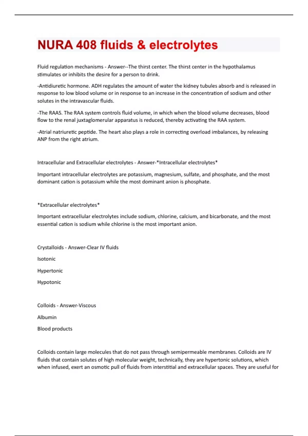 Fluid regulation mechanisms - Answer--The thirst center. The thirst center in the hypothalamus stimulates or inhibits the desire for a person to drink. -Antidiuretic hormone. ADH regulates the amount of water the kidney tubules absorb and is released in response to low blood volume or in response to an increase in the concentration of sodium and other solutes in the intravascular fluids. -The RAAS. The RAA system controls fluid volume, in which when the blood volume decreases, blood flow to the renal juxtaglomerular apparatus is reduced, thereby activating the RAA system. -Atrial natriuretic peptide. The heart also plays a role in correcting overload imbalances, by releasing ANP from the right atrium. Intracellular and Extracellular electrolytes - Answer-*Intracellular electrolytes* Important intracellular electrolytes are potassium, magnesium, sulfate, and phosphate, and the most dominant cation is potassium while the most dominant anion is phosphate. *Extracellular electrolytes* Important extracellular electrolytes include sodium, chlorine, calcium, and bicarbonate, and the most essential cation is sodium while chlorine is the most important anion. Crystalloids - Answer-Clear IV fluids Isotonic Hypertonic Hypotonic Colloids - Answer-Viscous Albumin Blood products Colloids contain large molecules that do not pass through semipermeable membranes. Colloids are IV fluids that contain solutes of high molecular weight, technically, they are hypertonic solutions, which when infused, exert an osmotic pull of fluids from interstitial and extracellular spaces. They are useful forexpanding the intravascular volume and raising blood pressure. Colloids are indicated for patients in malnourished states and patients who cannot tolerate large infusions of fluid. Nursing interventions: -Assess allergy history. -Use a large-bore needle (18-gauge). A larger needle is needed when administering colloid solutions. -Document baseline data. Before infusion, assess the patient's vital signs, edema status, lung sounds, and heart sounds. - -Continue monitoring during and after the infusion. -Monitor the patient's response. Monitor intake and output closely for signs of hypervolemia, hypertension, dyspnea, crackles in the lungs, and edema. -Monitor coagulation indexes. Colloid solutions can interfere with platelet function and increase bleeding times, so monitor the patient's coagulation indexes. Albumin - Answer-Human albumin is a solution derived from plasma. It has two strengths: 5% albumin and 25% albumin. 5% Albumin is a solution derived from plasma and is a commonly utilized colloid solution. It is used to increase the circulating volume and restore protein levels in conditions such as burns, pancreatitis, and plasma loss through trauma. 25% Albumin is used together with sodium and water restriction to reduce excessive edema. They are considered blood transfusion products and uses the same protocols and nursing precautions when administering albumin. The use of albumin is contraindicated in patients with the following conditions: severe anemia, heart failure, or known sensitivity to albumin. Additionally, angiotensin-converting enzyme inhibitors should be withheld for at least 24 hours before administering albumin because of the risk of atypical reactions, such as hypotension and flushing. Isotonic solutions - Answer--cells retain their normal size and shape in isotonic solutions (same solute/water concentration as inside cells; water moves in and out) -Technically, electrolyte solutions are considered isotonic if the total electrolyte content is approximately 310 mEq/L -Isotonic IV fluids have a total osmolality close to that of the ECF and do not cause red blood cells to shrink or swell. -Great for fluid replacement0.9% NaCl, lactated ringer's Hypotonic solutions - Answer-0.45% NaCl Push volume from ECF into the cell (ICF) Higher water concentration to hydrate the patient Hypotonic IV solutions have a lower osmolality and contain fewer solutes than plasma. They cause fluid shifts from the ECF into the ICF to achieve homeostasis, therefore, causing cells to swell and may even rupture. IV solutions are considered hypotonic if the total electrolyte content is less than 250 mEq/L. Uses: provide free water for excretion of body wastes, treat cellular dehydration, and replace the cellular fluid. Hypertonic solutions - Answer-3% Saline 5% Saline 10% Dextrose in Water (D10W) 5% Dextrose in 0.9% Saline 5% Dextrose in 0.45% saline 5% Dextrose in Lactated Ringer's