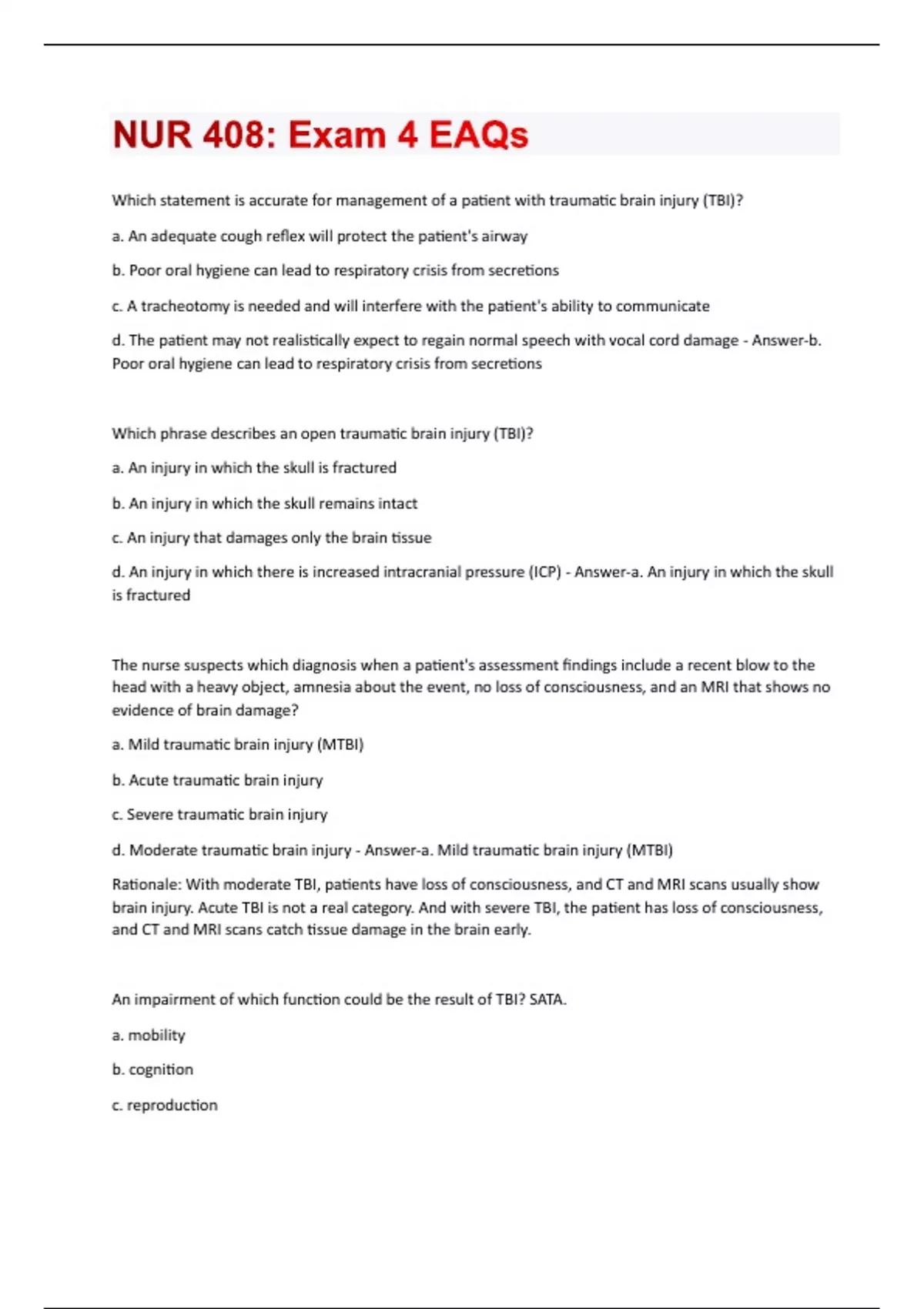 Which statement is accurate for management of a patient with traumatic brain injury (TBI)? a. An adequate cough reflex will protect the patient's airway b. Poor oral hygiene can lead to respiratory crisis from secretions c. A tracheotomy is needed and will interfere with the patient's ability to communicate d. The patient may not realistically expect to regain normal speech with vocal cord damage - Answer-b. Poor oral hygiene can lead to respiratory crisis from secretions Which phrase describes an open traumatic brain injury (TBI)? a. An injury in which the skull is fractured b. An injury in which the skull remains intact c. An injury that damages only the brain tissue d. An injury in which there is increased intracranial pressure (ICP) - Answer-a. An injury in which the skull is fractured The nurse suspects which diagnosis when a patient's assessment findings include a recent blow to the head with a heavy object, amnesia about the event, no loss of consciousness, and an MRI that shows no evidence of brain damage? a. Mild traumatic brain injury (MTBI) b. Acute traumatic brain injury c. Severe traumatic brain injury d. Moderate traumatic brain injury - Answer-a. Mild traumatic brain injury (MTBI) Rationale: With moderate TBI, patients have loss of consciousness, and CT and MRI scans usually show brain injury. Acute TBI is not a real category. And with severe TBI, the patient has loss of consciousness, and CT and MRI scans catch tissue damage in the brain early. An impairment of which function could be the result of TBI? SATA. a. mobility b. cognition c. reproductiond. sensory perception e. psychosocial function - Answer-a. mobility b. cognition d. sensory perception e. psychosocial function Which causes of TBI in the U.S. are the most common? SATA. a. falls b. violence c. physical abuse d. sports-related injuries e. motor vehicle crashes - Answer-a. falls e. motor vehicle crashes Which symptom concerns the nurse the most when assessing a patient with a TBI after a skateboarding incident? a. amnesia b. restlessness c. head laceration d. asymmetric pupils - Answer-d. asymmetric pupils Rationale: asymmetric (uneven) pupils, loss of light reaction, or unilateral or bilateral pupils are a sign of severe TBI. Amnesia, restless, and a head laceration could be symptoms of mild TBI. Which statement describes an indirect traumatic brain injury (TBI)? a. Force was applied directly to the patient's head b. Force was applied to the head by an object or tool, not another body part c. Force was applied to another body part, but the brain was still affected d. Force was applied to the brain because of an accident and not an intentional injury - Answer-c. Force was applied to another body part, but the brain was still affectedA patient who is scheduled to undergo bone marrow transplant will have high-dose chemotherapy followed by total body irradiation (TBI) just before the transplant. Which statement by the patient indicates a need for further teaching about the purpose of this therapy? a. my bone marrow cells will be obliterated b. any remaining leukemic cells will be obliterated c. graft-versus-host disease will control the cancer d. my immune system will be replaced with the transplant - Answer-c. graft-versus-host disease will control the cancer Rationale: Patients who are receiving lower (not higher) doses of chemotherapy and TBI rely on graftversus-host disease to control the cancer. Which type of traumatic brain injury (TBI) is caused by an external force contacting the head, suddenly placing the head in motion? a. deceleration injury b. acceleration injury c. open traumatic brain injury d. closed traumatic brain injury - Answer-b. acceleration injury Rationale: A deceleration injury occurs when the moving head is suddenly stopped or hits a stationary object. Which phrase describes TBI? a. injury to the brain from a congenital condition b. damage to the brain from an external mechanical force c. impairment of the brain caused by neurodegeneration d. diminishing functionality of the brain due to internal forces - Answer-b. damage to the brain from an external mechanical force Rationale: TBI is not caused by congenital conditions, neurodegeneration, or internal forces. The nurse discusses which common cause of TBI in older adults when providing education for a community group? a. alzheimer disease b. motor vehicle crashesc. falls d. stroke - Answer-c. falls Rationale: Alzheimer disease and strokes are not classified as TBIs. To treat a patient with a severe TBI, which intervention reduces brain metabolism and prevents the cascade of molecular and biochemical events that contribute to secondary brain injury? a. a barbiturate coma b. placement of an intraventricular catheter c. therapeutic hypothermia d. a decompressive craniectomy surgery - Answer-c. therapeutic hypothermia Since admission to the hospital after a TBI, a patient has been active and oriented and experiencing mild headaches. Which action does the nurse take when increased dilation of the pupils and a sluggish response to light are new assessment findings? a. notify the health care provider immediately b. reassess the patient in 2 hours c. elevate the head of the bed to 60 degrees d. ask the patient to read some printed material - Answer-a. notify the health care provider immediately