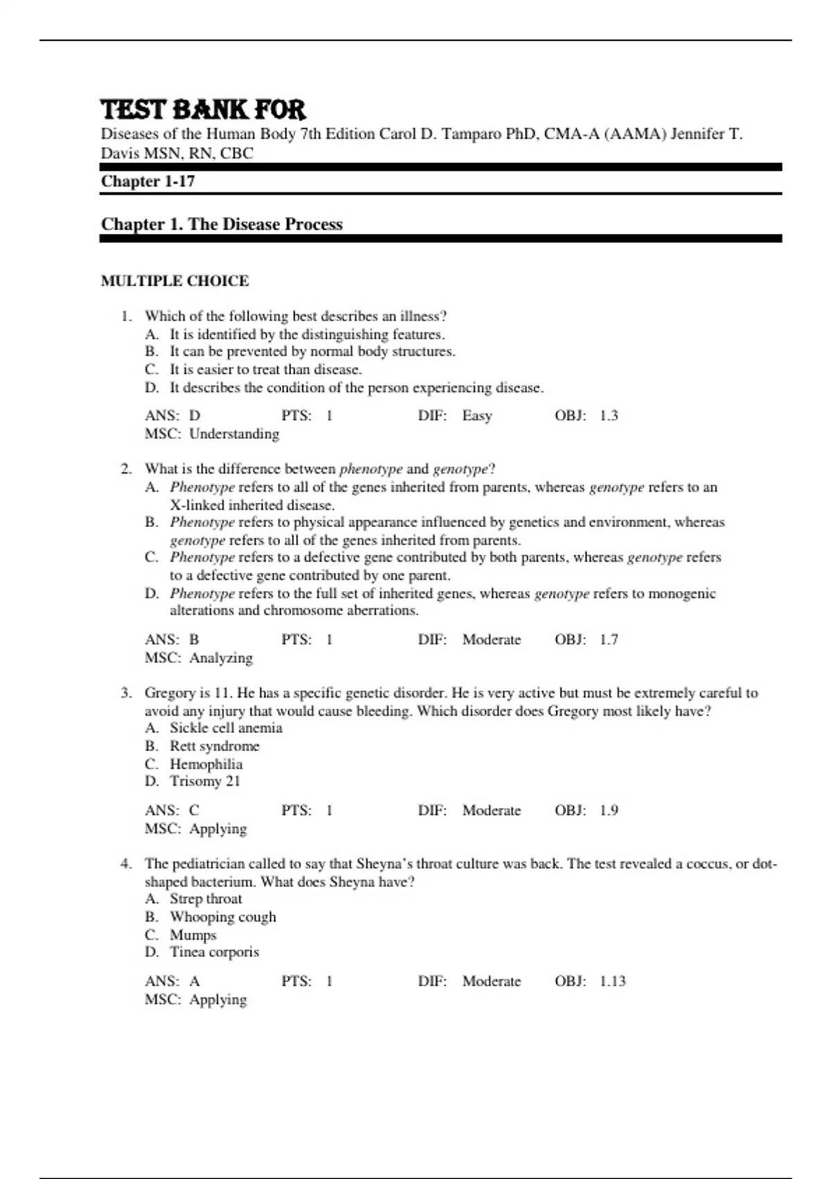 Test Bank For Diseases of the Human Body 7th Edition by Carol D. Tamparo PhD, CMA-A (AAMA) Jennifer T. Davis MSN, RN, CBC Chapter 1-17
