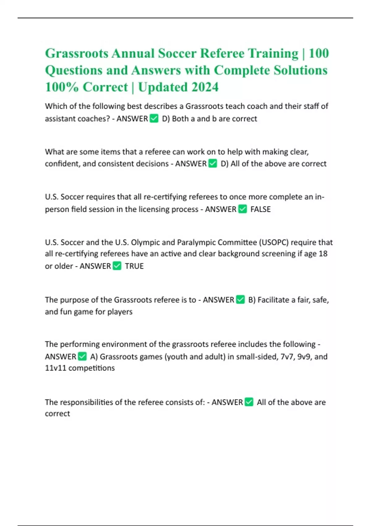 Grassroots Annual Soccer Referee Training | 100 Questions and Answers with Complete Solutions 100% Correct | Updated 2024