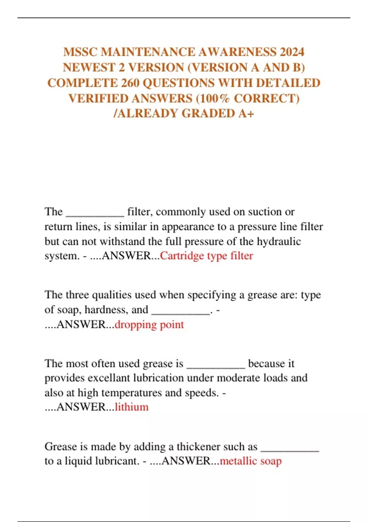 MSSC MAINTENANCE AWARENESS 2024 NEWEST 2 VERSION (VERSION A AND B) COMPLETE 260 QUESTIONS WITH DETAILED VERIFIED ANSWERS (100% CORRECT) /ALREADY GRADED A+