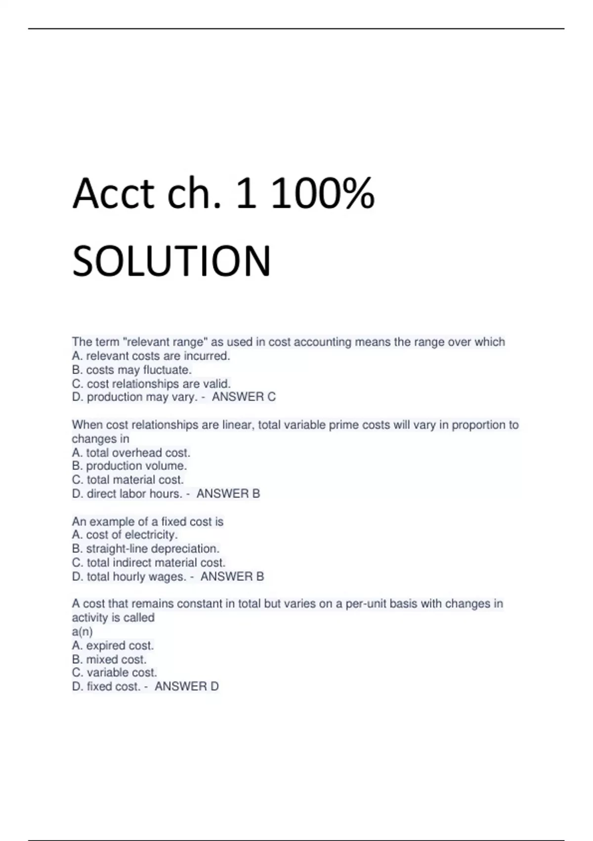 Acct ch. 1 100% SOLUTION The term "relevant range" as used in cost accounting means the range over which A. relevant costs are incurred. B. costs may fluctuate. C. cost relationships are valid. D. production may vary. - ANSWER C When cost relationships are linear, total variable prime costs will vary in proportion to changes in A. total overhead cost. B. production volume. C. total material cost. D. direct labor hours. - ANSWER B An example of a fixed cost is A. cost of electricity. B. straight-line depreciation. C. total indirect material cost. D. total hourly wages. - ANSWER B A cost that remains constant in total but varies on a per-unit basis with changes in activity is called a(n) A. expired cost. B. mixed cost. C. variable cost. D. fixed cost. - ANSWER D Product costs are deducted from revenue A. to minimize taxable income. B. as goods are sold. C. as expenditures are made. D. when production is completed. - ANSWER B When the number of units manufactured increases, the most significant change in unit cost will be reflected as a(n) A. decrease in the fixed element. B. decrease in the variable element. C. increase in the mixed element. D. increase in the fixed element. - ANSWER A Which of the following is not a product cost component? A. commission on the sale of a product B. rent on a factory building C. janitorial supplies used in a factory D. indirect production labor wages - ANSWER A Period costs A. are expensed in the same period in which they are incurred. B. are associated with the periodic inventory method. C. are always variable costs. D. remain unchanged over a given period of time. - ANSWER A The indirect costs of converting raw material into finished goods are called A. conversion costs. B. period costs. C. prime costs. D. overhead costs. - ANSWER D . Conversion cost does not include A. factory depreciation. B. direct material. C. supervisors' salaries. D. direct labor. - ANSWER B The distinction between direct and indirect costs depends on whether a cost A. is controllable or non-controllable. B. is variable or fixed. C. can be conveniently and physically traced to a cost object under consideration. D. will increase with changes in levels of activity. - ANSWER C . All costs related to the manufacturing function in a company are A. prime costs. B. conversion costs. C. product costs. D. direct costs. - ANSWER C . The term "prime cost" refers to A. all manufacturing costs other than direct labor and raw material costs. B. all manufacturing costs incurred to produce units of output. C. raw material purchased and direct labor costs. D. the raw material used and direct labor costs. - AN