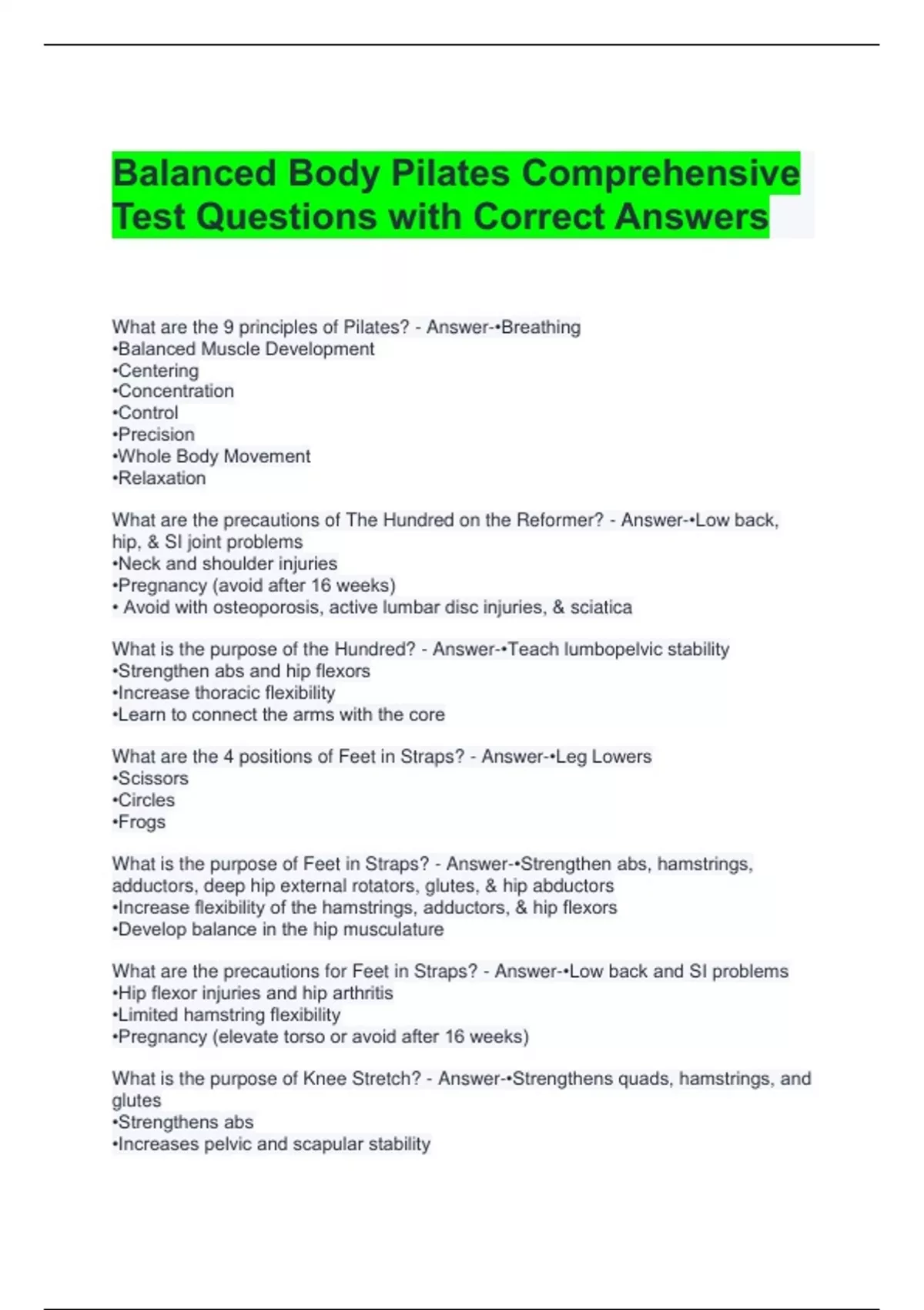 Balanced Body Pilates Comprehensive Test Questions with Correct Answers What are the 9 principles of Pilates? - Answer-•Breathing •Balanced Muscle Development •Centering •Concentration •Control •Precision •Whole Body Movement •Relaxation What are the precautions of The Hundred on the Reformer? - Answer-•Low back, hip, & SI joint problems •Neck and shoulder injuries •Pregnancy (avoid after 16 weeks) • Avoid with osteoporosis, active lumbar disc injuries, & sciatica What is the purpose of the Hundred? - Answer-•Teach lumbopelvic stability •Strengthen abs and hip flexors •Increase thoracic flexibility •Learn to connect the arms with the core What are the 4 positions of Feet in Straps? - Answer-•Leg Lowers •Scissors •Circles •Frogs What is the purpose of Feet in Straps? - Answer-•Strengthen abs, hamstrings, adductors, deep hip external rotators, glutes, & hip abductors •Increase flexibility of the hamstrings, adductors, & hip flexors •Develop balance in the hip musculature What are the precautions for Feet in Straps? - Answer-•Low back and SI problems •Hip flexor injuries and hip arthritis •Limited hamstring flexibility •Pregnancy (elevate torso or avoid after 16 weeks