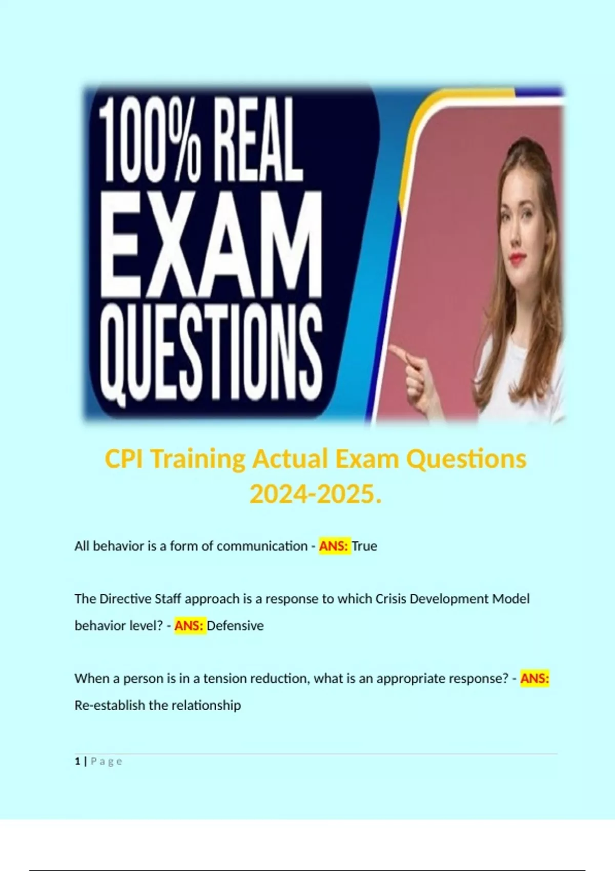 CPI Training Actual Exam Questions . Contains Terms like: All behavior is a form of communication - ANS: True The Directive Staff approach is a response to which Crisis Development Model behavior level? - ANS: Defensive When a person is in a tension reduction, what is an appropriate response? - ANS: Re-establish the relationship