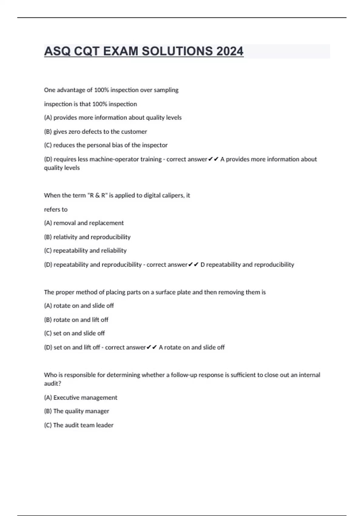 ASQ CQT EXAM SOLUTIONS 2024 One advantage of 100% inspection over sampling inspection is that 100% inspection (A) provides more information about quality levels (B) gives zero defects to the customer (C) reduces the personal bias of the inspector (D) requires less machine-operator training - correct answer A provides more information about quality levels W