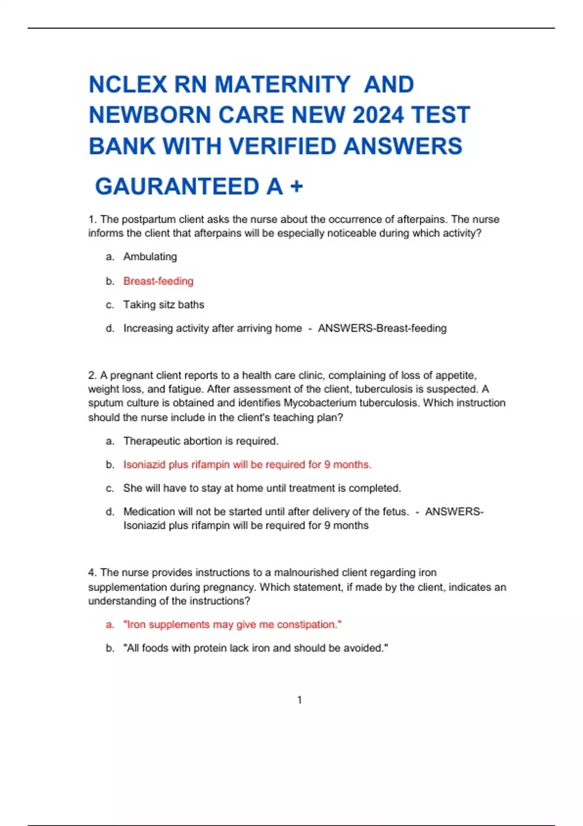 1. The postpartum client asks the nurse about the occurrence of afterpains. The nurse