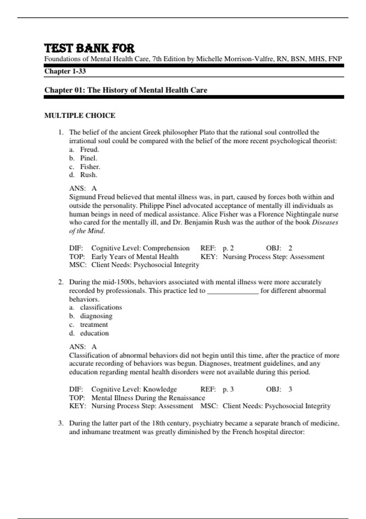 Test Bank For Foundations of Mental Health Care, 7th Edition by Michelle Morrison-Valfre, RN, BSN, MHS, FNP Chapter 1-33