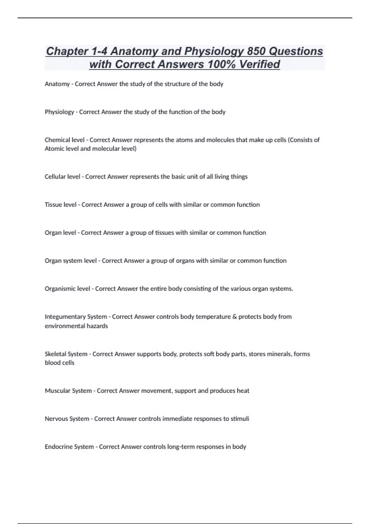 Anatomy - Correct Answer the study of the structure of the body Physiology - Correct Answer the study of the function of the body Chemical level - Correct Answer represents the atoms and molecules that make up cells (Consists of Atomic level and molecular level) Cellular level - Correct Answer represents the basic unit of all living things Tissue level - Correct Answer a group of cells with similar or common function Organ level - Correct Answer a group of tissues with similar or common function Organ system level - Correct Answer a group of organs with similar or common function Organismic level - Correct Answer the entire body consisting of the various organ systems. Integumentary System - Correct Answer controls body temperature & protects body from environmental hazards Skeletal System - Correct Answer supports body, protects soft body parts, stores minerals, forms blood cells Muscular System - Correct Answer movement, support and produces heat Nervous System - Correct Answer controls immediate responses to stimuli Endocrine System - Correct Answer controls long-term responses in body