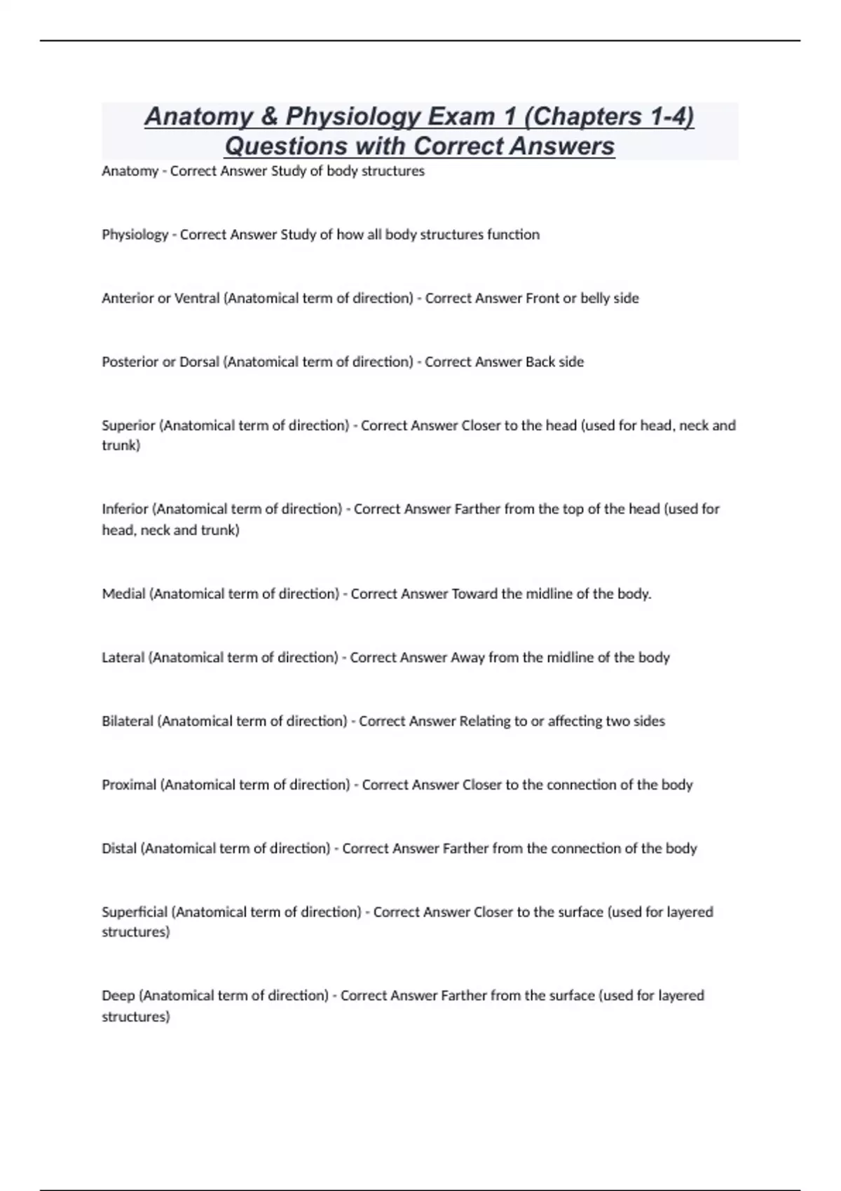 Anatomy & Physiology Exam 1 (Chapters 1-4) Questions with Correct Answers Anatomy - Correct Answer Study of body structures Physiology - Correct Answer Study of how all body structures function Anterior or Ventral (Anatomical term of direction) - Correct Answer Front or belly side Posterior or Dorsal (Anatomical term of direction) - Correct Answer Back side Superior (Anatomical term of direction) - Correct Answer Closer to the head (used for head, neck and trunk) Inferior (Anatomical term of direction) - Correct Answer Farther from the top of the head (used for head, neck and trunk) Medial (Anatomical term of direction) - Correct Answer Toward the midline of the body. Lateral (Anatomical term of direction) - Correct Answer Away from the midline of the body Bilateral (Anatomical term of direction) - Correct Answer Relating to or affecting two sides Proximal (Anatomical term of direction) - Correct Answer Closer to the connection of the body Distal (Anatomical term of direction) - Correct Answer Farther from the connection of the body Superficial (Anatomical term of direction) - Correct Answer Closer to the surface (used for layered structures) Deep (Anatomical term of direction) - Correct Answer Farther from the surface (used for layered structures)