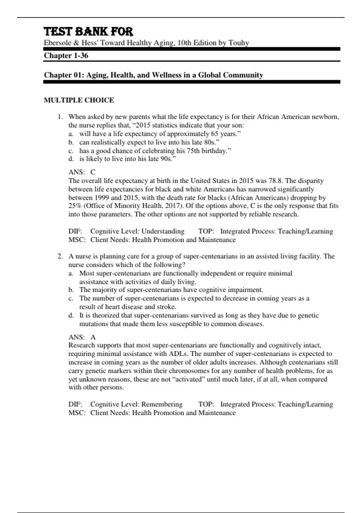 Test Bank For Ebersole & Hess' Toward Healthy Aging, 10th Edition by Touhy Chapter 1-36