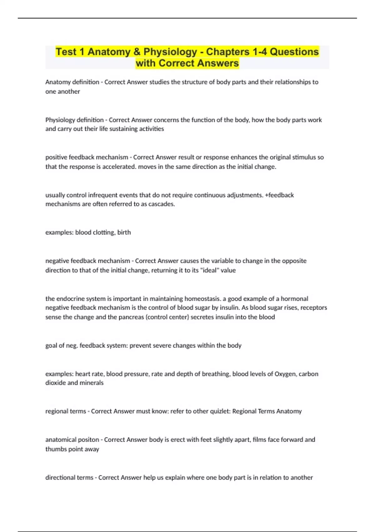 Anatomy definition - Correct Answer studies the structure of body parts and their relationships to one another Physiology definition - Correct Answer concerns the function of the body, how the body parts work and carry out their life sustaining activities positive feedback mechanism - Correct Answer result or response enhances the original stimulus so that the response is accelerated. moves in the same direction as the initial change. usually control infrequent events that do not require continuous adjustments. +feedback mechanisms are often referred to as cascades. examples: blood clotting, birth negative feedback mechanism - Correct Answer causes the variable to change in the opposite direction to that of the initial change, returning it to its "ideal" value the endocrine system is important in maintaining homeostasis. a good example of a hormonal negative feedback mechanism is the control of blood sugar by insulin. As blood sugar rises, receptors sense the change and the pancreas (control center) secretes insulin into the blood goal of neg. feedback system: prevent severe changes within the body examples: heart rate, blood pressure, rate and depth of breathing, blood levels of Oxygen, carbon dioxide and minerals regional terms - Correct Answer must know: refer to other quizlet: Regional Terms Anatomy anatomical positon - Correct Answer body is erect with feet slightly apart, films face forward and thumbs point away directional terms - Correct Answer help us explain where one body part is in relation to another