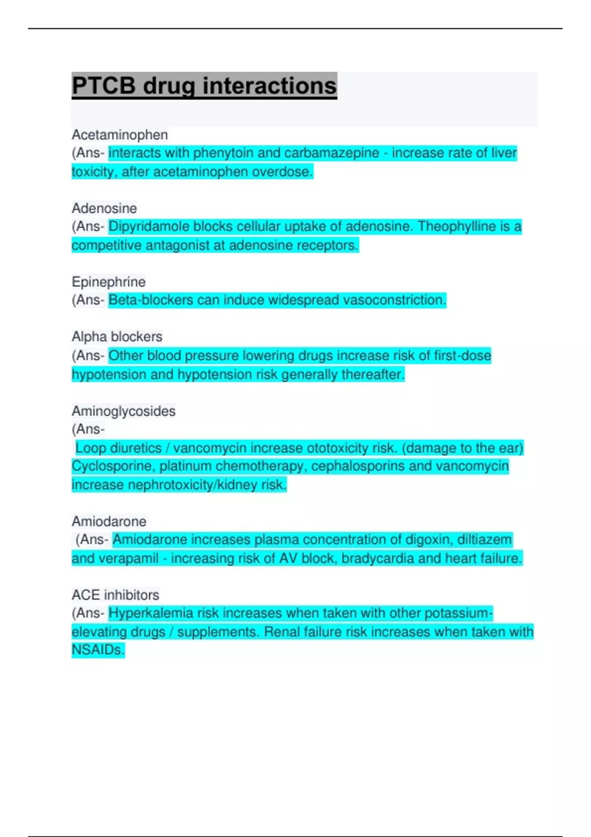 Acetaminophen (Ans- interacts with phenytoin and carbamazepine - increase rate of liver toxicity, after acetaminophen overdose. Adenosine (Ans- Dipyridamole blocks cellular uptake of adenosine. Theophylline is a competitive antagonist at adenosine receptors. Epinephrine (Ans- Beta-blockers can induce widespread vasoconstriction. Alpha blockers (Ans- Other blood pressure lowering drugs increase risk of first-dose hypotension and hypotension risk generally thereafter. Aminoglycosides (Ans- Loop diuretics / vancomycin increase ototoxicity risk. (damage to the ear) Cyclosporine, platinum chemotherapy, cephalosporins and vancomycin increase nephrotoxicity/kidney risk. Amiodarone (Ans- Amiodarone increase