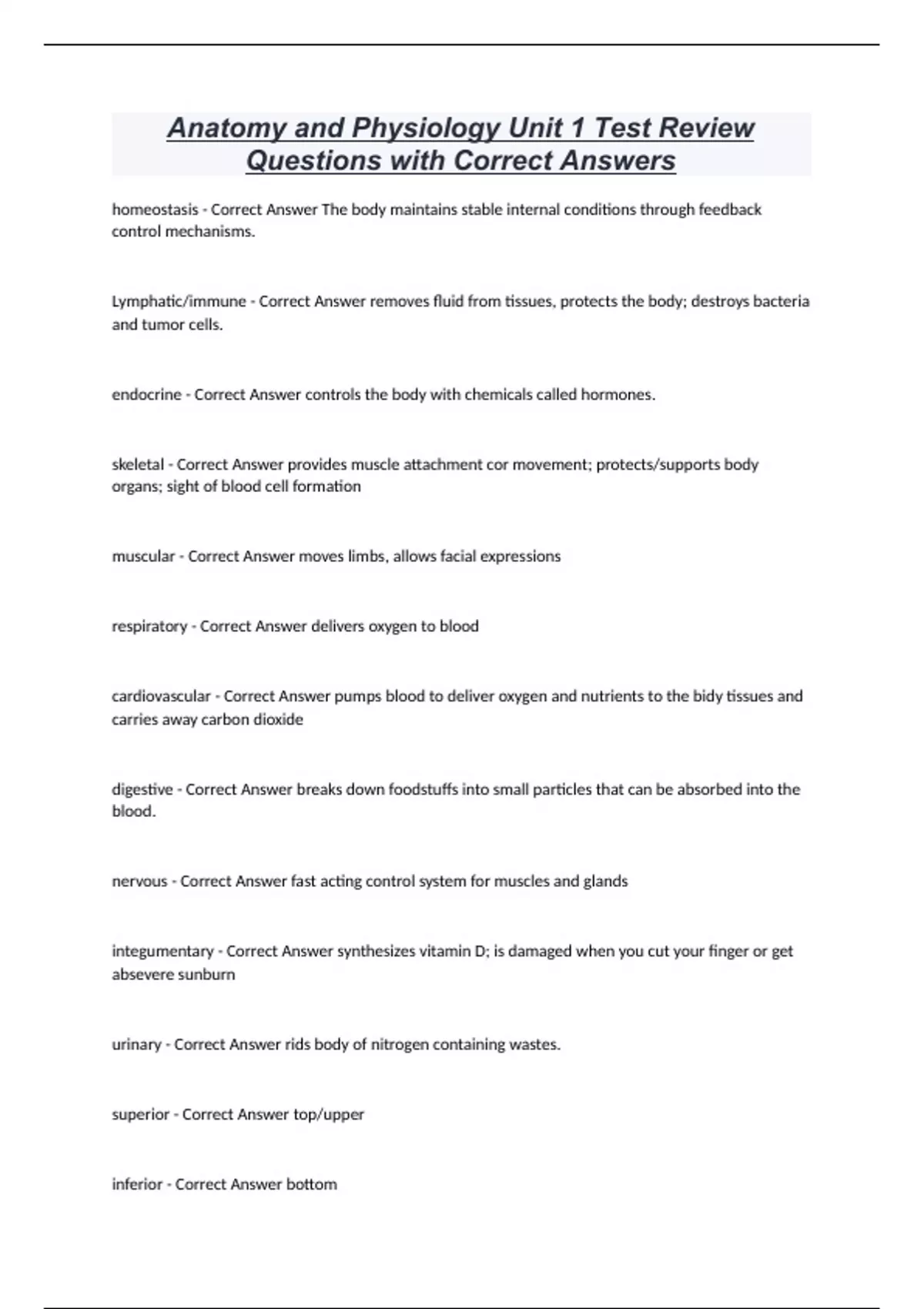 Anatomy and Physiology Unit 1 Test Review Questions with Correct Answers