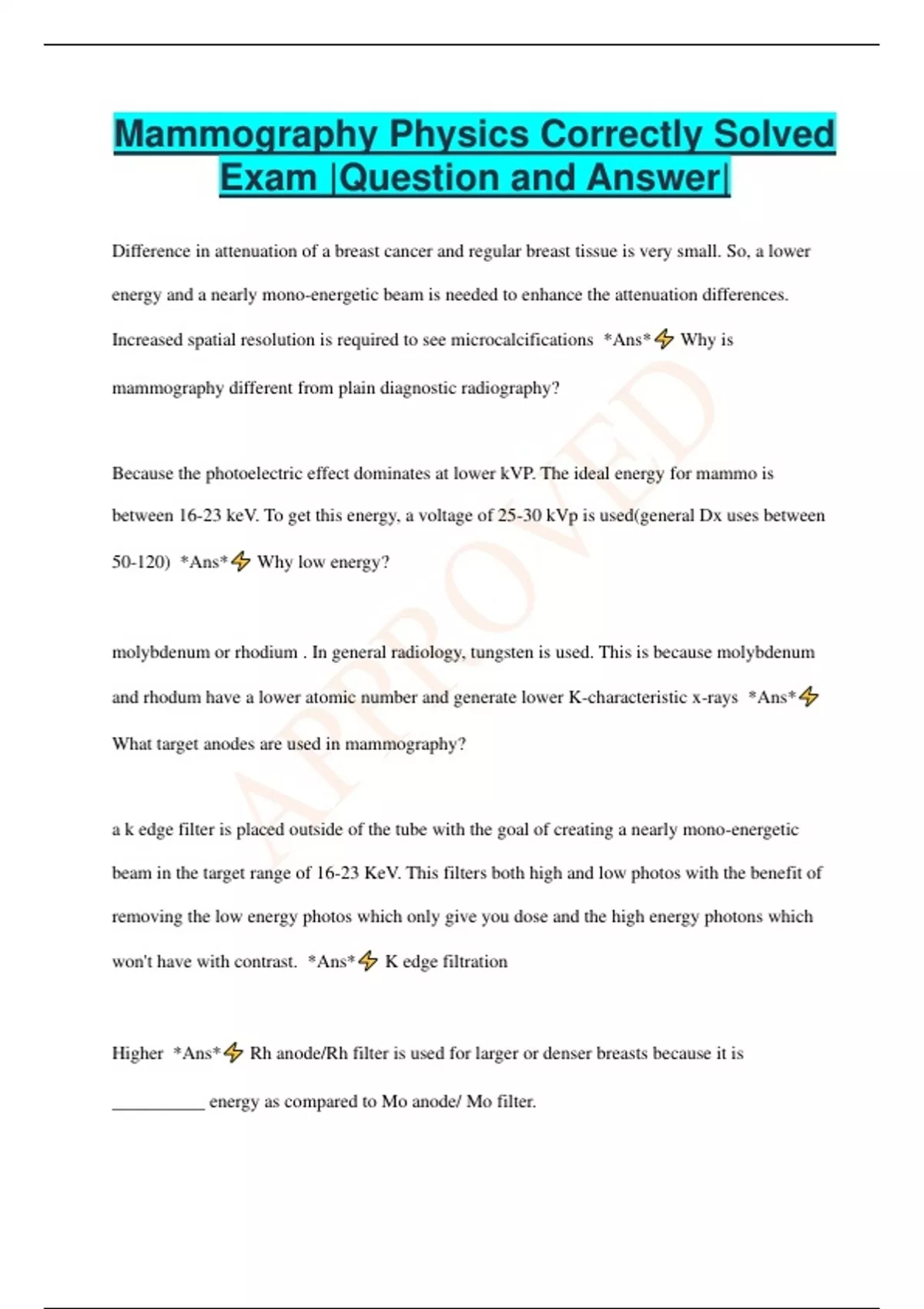 Mammography Physics Correctly Solved Exam |Question and Answer| Difference in attenuation of a breast cancer and regular breast tissue is very small. So, a lower energy and a nearly mono-energetic beam is needed to enhance the attenuation differences. Increased spatial resolution is required to see microcalcifications *Ans* Why is mammography different from plain diagnostic radiography? Because the photoelectric effect dominates at lower kVP. The ideal energy for mammo is between 16-23 keV. To get this energy, a voltage of 25-30 kVp is used(general Dx uses between 50-120) *Ans* Why low energy? molybdenum or rhodium . In general radiology, tungsten is used. This is because molybdenum and rhodum have a lower atomic number and generate lower K-characteristic x-rays *Ans* What target anodes are used in mammography? a k edge filter is placed outside of the tube with the goal of creating a nearly mono-energetic beam in the target range of 16-23 KeV. This filters both high and low photos with the benefit of removing the low energy photos which only give you dose and the high energy photons which won't have with contrast. *Ans* K edge filtration Higher *Ans* Rh anode/Rh filter is used for larger or denser breasts because it is __________ energy as compared to Mo anode/ Mo filter. Mo anode with Rhodium Filter *Ans* Which combination of anode and filter in mammography is used to give an intermediate energy? 0.3, 0.1 mm(general x-ray uses focal spots of 0.6 and 1.2 mm) This is because mammography requires a better spatial resolution *Ans* A focal spot of ____ and ____ mm is used in mammography because? Lower. mA is limited to 50 for 0.1 mm and 100 for 0.3 mm. *Ans* .Because of the smaller focal spot in mammography, the mA is _________ as compared to conventional radiography Longer *Ans* Because of the lower mA, a __________ exposure time is used in mammography. Chest wall. The loss of energy on the anode side(nipple side) is compensated for by angling the tube up about 20 degrees *Ans* The cathode side goes near the ______________ due to the heel effect. Beryllium; Pyrex Glass. *Ans* What type of exit window is used in mammography? In conventional radiography? Reduced thickness=less scatter=lower kVP can be chosen. Lower kVP and less scatter=improved contrast. Reduced thickness=less mAs needed=les