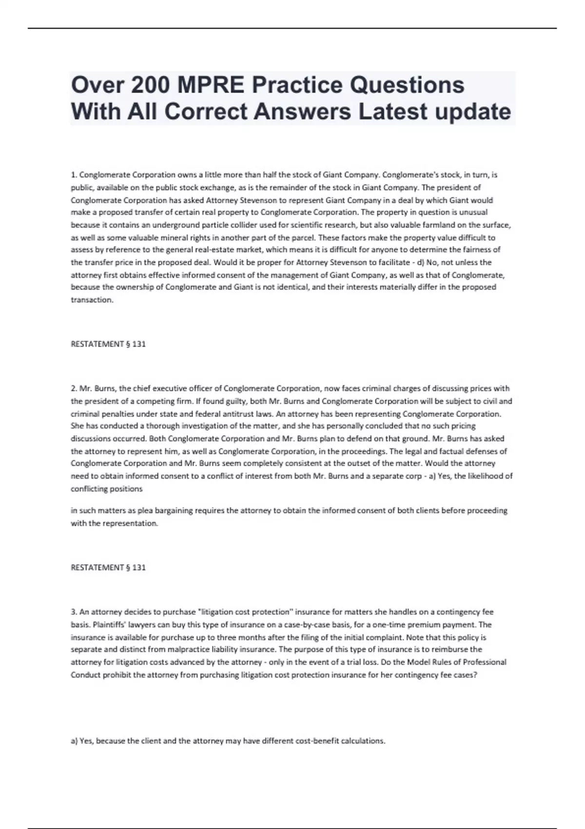 Over 200 MPRE Practice Questions With All Correct Answers Latest update 1. Conglomerate Corporation owns a little more than half the stock of Giant Company. Conglomerate's stock, in turn, is public, available on the public stock exchange, as is the remainder of the stock in Giant Company. The president of Conglomerate Corporation has asked Attorney Stevenson to represent Giant Company in a deal by which Giant would make a proposed transfer of certain real property to Conglomerate Corporation. The property in question is unusual because it contains an underground particle collider used for scientific research, but also valuable farmland on the surface, as well as some valuable mineral rights in another part of the parcel. These factors make the property value difficult to assess by reference to the general real-estate market, which means it is difficult for anyone to determine the fairness of the transfer price in the proposed deal. Would it be proper for Attorney Stevenson to facilitate - d) No, not unless the attorney first obtains effective informed consent of the management of Giant Company, as well as that of Conglomerate, because the ownership of Conglomerate and Giant is not identical, and their interests materially differ in the proposed transaction.........