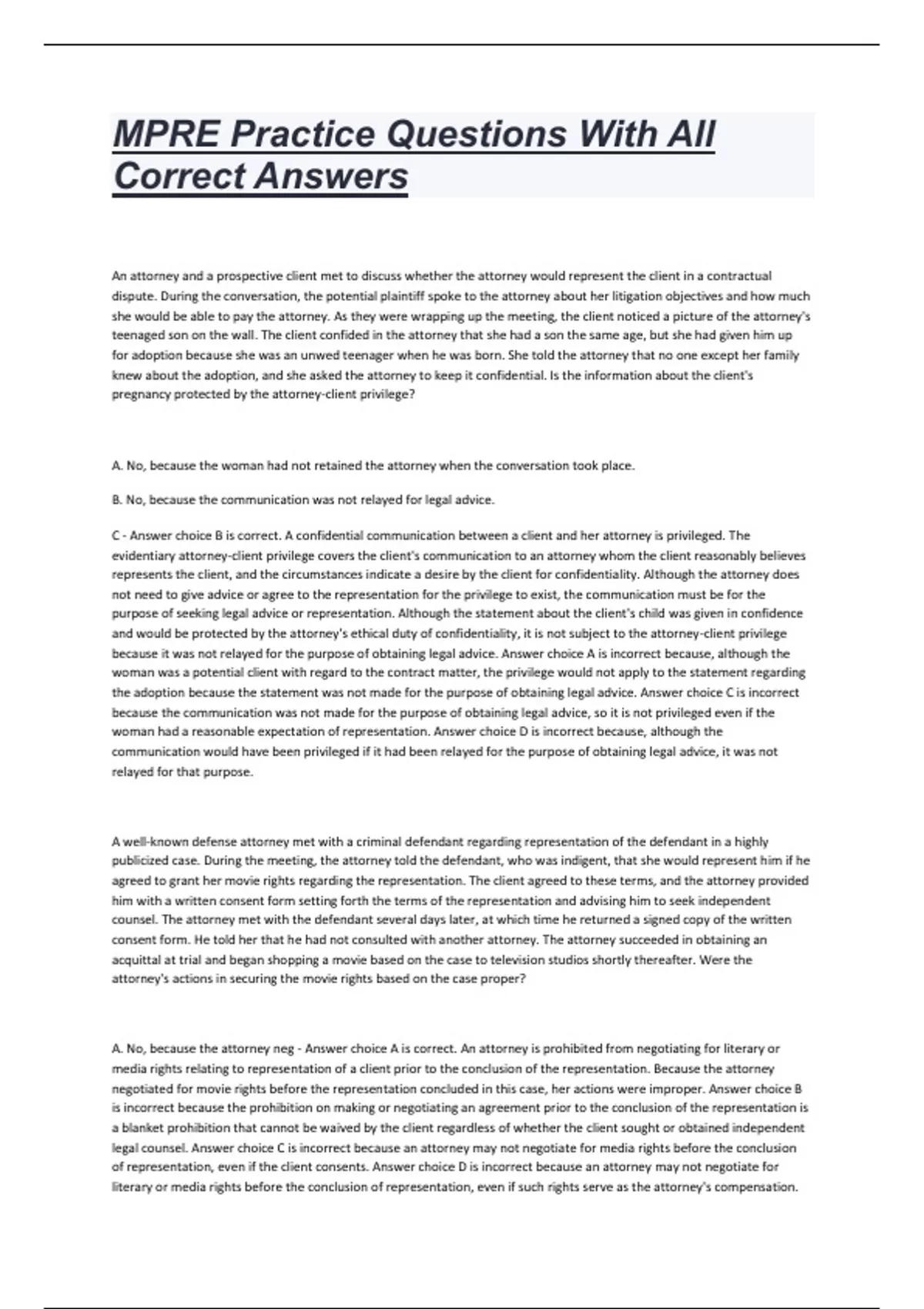 MPRE Practice Questions With All Correct Answers An attorney and a prospective client met to discuss whether the attorney would represent the client in a contractual dispute. During the conversation, the potential plaintiff spoke to the attorney about her litigation objectives and how much she would be able to pay the attorney. As they were wrapping up the meeting, the client noticed a picture of the attorney's teenaged son on the wall. The client confided in the attorney that she had a son the same age, but she had given him up for adoption because she was an unwed teenager when he was born. She told the attorney that no one except her family knew about the adoption, and she asked the attorney to keep it confidential. Is the information about the client's pregnancy protected by the attorney-client privilege? A. No, because the woman had not retained the attorney when the conversation took place. B. No, because the communication was not relayed for legal advice. C - Answer choice B is correct. A confidential communication between a client and her attorney is privileged. The evidentiary attorney-client privilege covers the client's communication to an attorney whom the client reasonably believes represents the client, and the circumstances indicate a desire by the client for confidentiality. Although the attorney does not need to give advice or agree to the representation for the privilege to exist, the communication must be for the purpose of seeking legal advice or representation. Although the statement about the client's child was given in confidence and would be protected by the attorney's ethical duty of confidentiality, it is not subject to the attorney-client privilege because it was not relayed for the purpose of obtaining legal advice. Answer choice A is incorrect because, although the woman was a potential client with regard to the contract matter, the privilege would not apply to the statement regarding the adoption because the statement was not made for the purpose of obtaining legal advice. Answer choice C is incorrect because the communication was not made for the purpose of obtaining legal advice, so it is not privileged even if the woman had a reasonable expectation of representation. Answer choice D is incorrect because, although the communication would have been privileged if it had been relayed for the purpose of obtaining legal advice, it was not relayed for that purpose.......