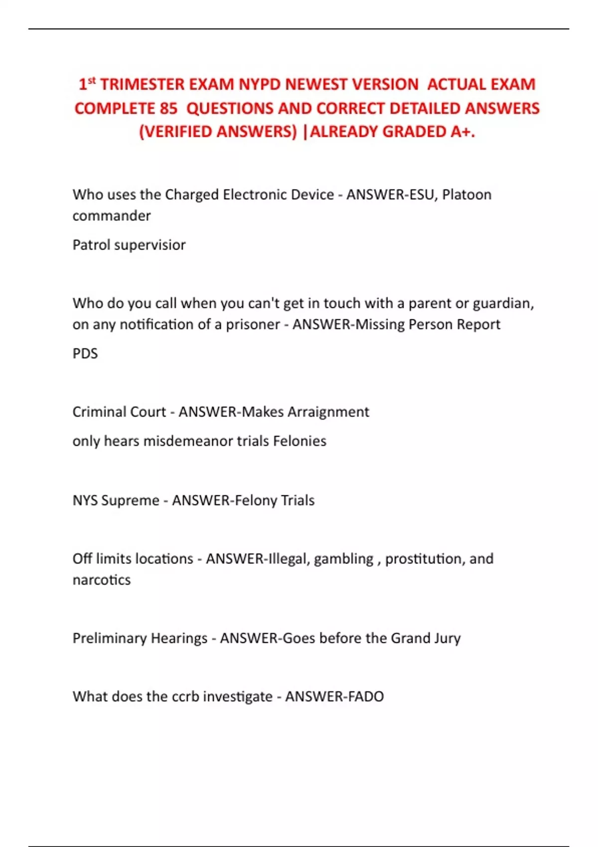 1st TRIMESTER EXAM NYPD NEWEST VERSION ACTUAL EXAM COMPLETE 85 QUESTIONS AND CORRECT DETAILED ANSWERS (VERIFIED ANSWERS) |ALREADY GRADED A+.