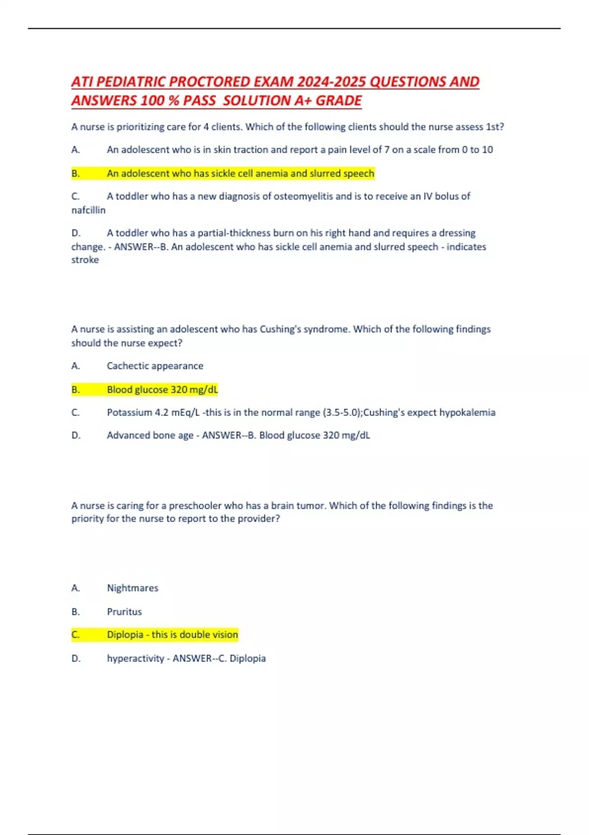 ATI PEDIATRIC PROCTORED EXAM QUESTIONS AND ANSWERS 100 % PASS SOLUTION A+ GRADE