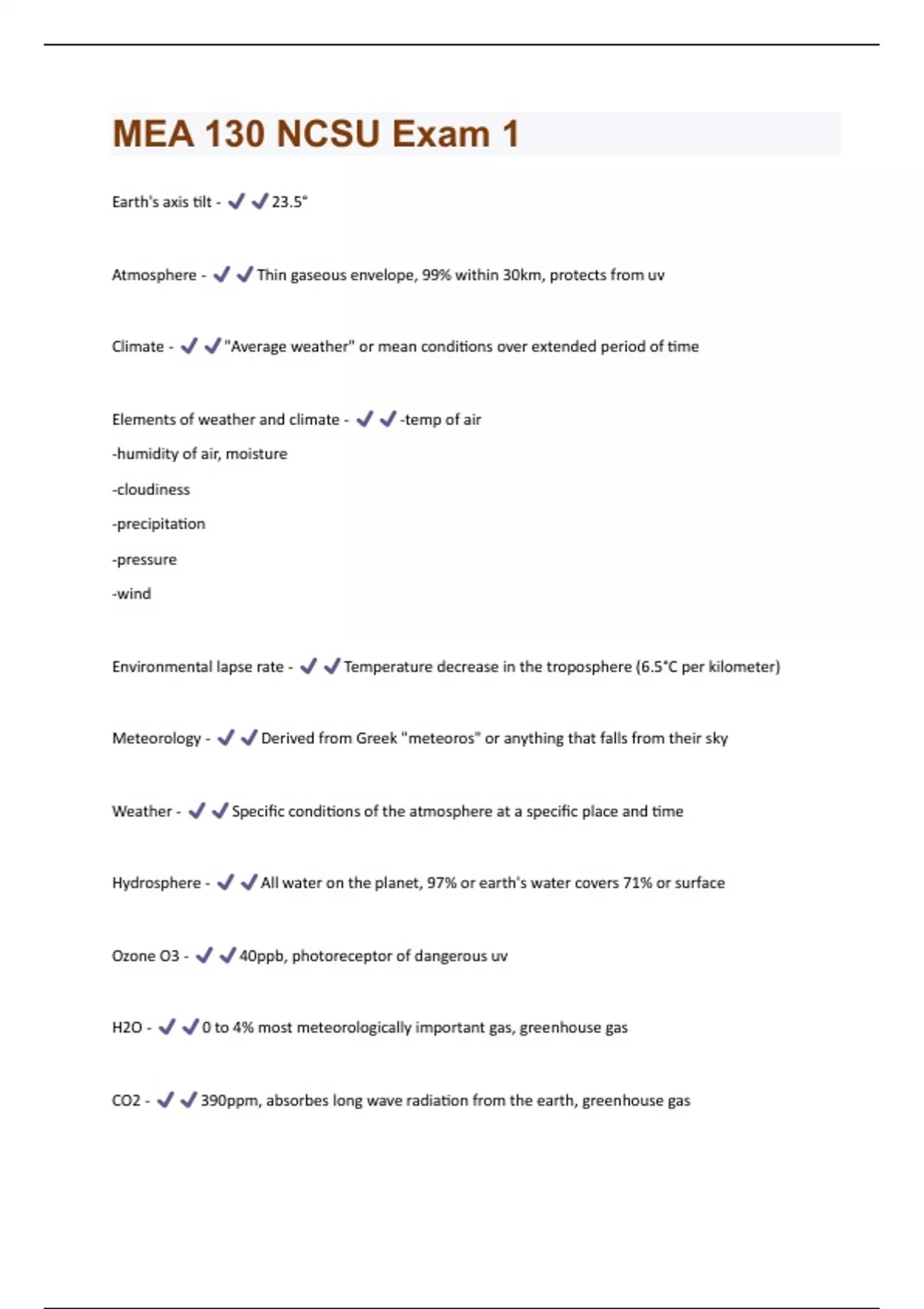 Earth's axis tilt - 23.5° Atmosphere - Thin gaseous envelope, 99% within 30km, protects from uv Climate - "Average weather" or mean conditions over extended period of time Elements of weather and climate - -temp of air -humidity of air, moisture -cloudiness -precipitation -pressure -wind Environmental lapse rate - Temperature decrease in the troposphere (6.5°C per kilometer) Meteorology - Derived from Greek "meteoros" or anything that falls from their sky Weather - Specific conditions of the atmosphere at a specific place and time Hydrosphere - All water on the planet, 97% or earth's water covers 71% or surface Ozone O3 - 40ppb, photoreceptor of dangerous uv H2O - 0 to 4% most meteorologically important gas, greenhouse gas CO2 - 390ppm, absorbes long wave radiation from the earth, greenhouse gasArgon - ~1% Nitrogen - 78% of atmosphere Troposphere - Greek "Tropein" turn or change, air is mixed well, most weather occurs here Radiosonde - Sent up in atmosphere to collect data Stratosphere - Stratified, not well mixed, temp inversion increase with height Tropopause - Isothermal layer, Around 12km "Equal tempature" separates troposphere from stratosphere Solar Elevation angle - Greek B, omega is latitude, N is Julian day of the year Temperature - Degree of hotness or coldness, generally decreases with height, is a form of kinetic energy Moisture - Measure of water content, relativetc humidity, dewpoint Synoptic - "Seen together" weather on map nationwide (thing with them dot and the numbers around it) Heat waves - #1 killer in average year, #2 is floods Hydrological (water) cycle - Evaporation, sublimation, transpiration, condensation, deposition, precipitationOxygen O2 - 21% of atmosphere Montreal Protocol - 1987 International agreement to stop chlorofluorocarbon (CFO) emmisions which degrade O3 Pressure - Weight of the atmosphere above a given point, always decreases with height Solar Radiation - Knowing the solar elevation angle calculate, J measure of intensity of solar radiation in watts per Sq m Summer solstice - (For us north hemi) sun at highest in sky, more than 12hr sunlight, directly overhead at 23.5°N Winter Solstice - Sun lowest in sky, less than 12 hr sunlight Equinox - Equal night, Autumnal and Vernal, 12hr or light and dark everywhere, sun directly overhead at equator Energy - Capacity to do work, potential (virtue of position) and kinetic (virtue of motion) Heat - Energy in process of being transfered between or within substance, hot->cold Conduction - Transfer of heat by molecular activity, larger temp faster transfer, solids are good conductors, air is poor, only occurs at earth's surface Convection - Vertical transfer of heat by mass movement of fluid Advection - Horizontal transfer of heatRadiation - Propagation of heat through electromagnetic waves, does not need medium, only release when striking object, occurs at speed of light, as wavelength decreases energy increases UV-Rays - A sunburn, B sunburn and skin cancer, C most harmful absorbed by O3 Stefan-Boltzman Law - E=oT^4 All objects emit radiant energy Wiens Displacement Law - Max wavelength = Constant/ Temp Hotter means shorter wavelength Kirchhoffs Law - Objects good at emiting and absorbing radiation at same wavelength Blackbodies - Both emit and absorb all radiation possible, atmosphere is not, sun and earth are close at 70-90% Latitude - Horizontal slices of earth, major controller of temperature along with ocean currents, altitude, geographic position, cloud cover, and different heating between land and water Specific Heat - Amount of heat needed to raise temperature of 1g by 1°C, land heats 3x faster than water Thermister - Temperature by flow of electricity, used on radiosondes Absolute zero - Lowest temperature possible, all molecules stop moving, 0K -273C -459F Degree Days - Take away 65 from average